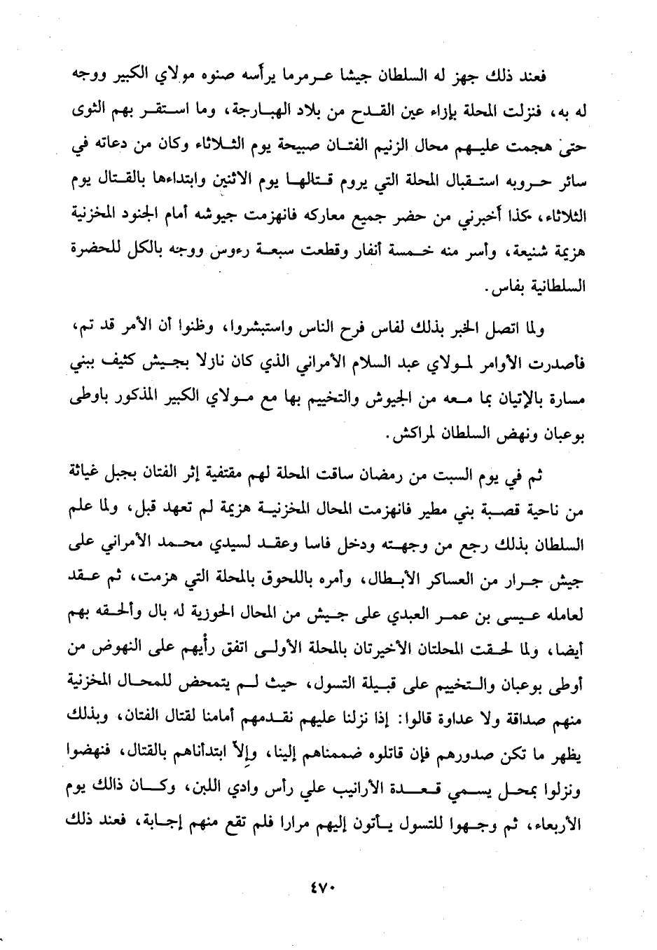 فعند ذلك جهز له السلطان جيشا عرمرما يرأسه صنوه مولاي الكبير ووجه له به، فنزلت المحلة بإزاء عين القدح من بلاد الهبارجة، وما استقر بهم الثوى حتى هجمت عليهم محال الزنيم الفتان صبيحة يوم الثلاثاء وكان من دعاته في سائر حروبه استقبال المحلة التي يروم قتالها يوم الاثنين وابتداءها بالقتال يوم الثلاثاء، كذا أخبرني من حضر جميع معاركه فانهزمت جيوشه أمام الجنود المخزنية هزيمة شنيعة، وأسر منه خمسة أنفار وقطعت سبعة رءوس ووجه بالكل للحضرة السلطانية بفاس.