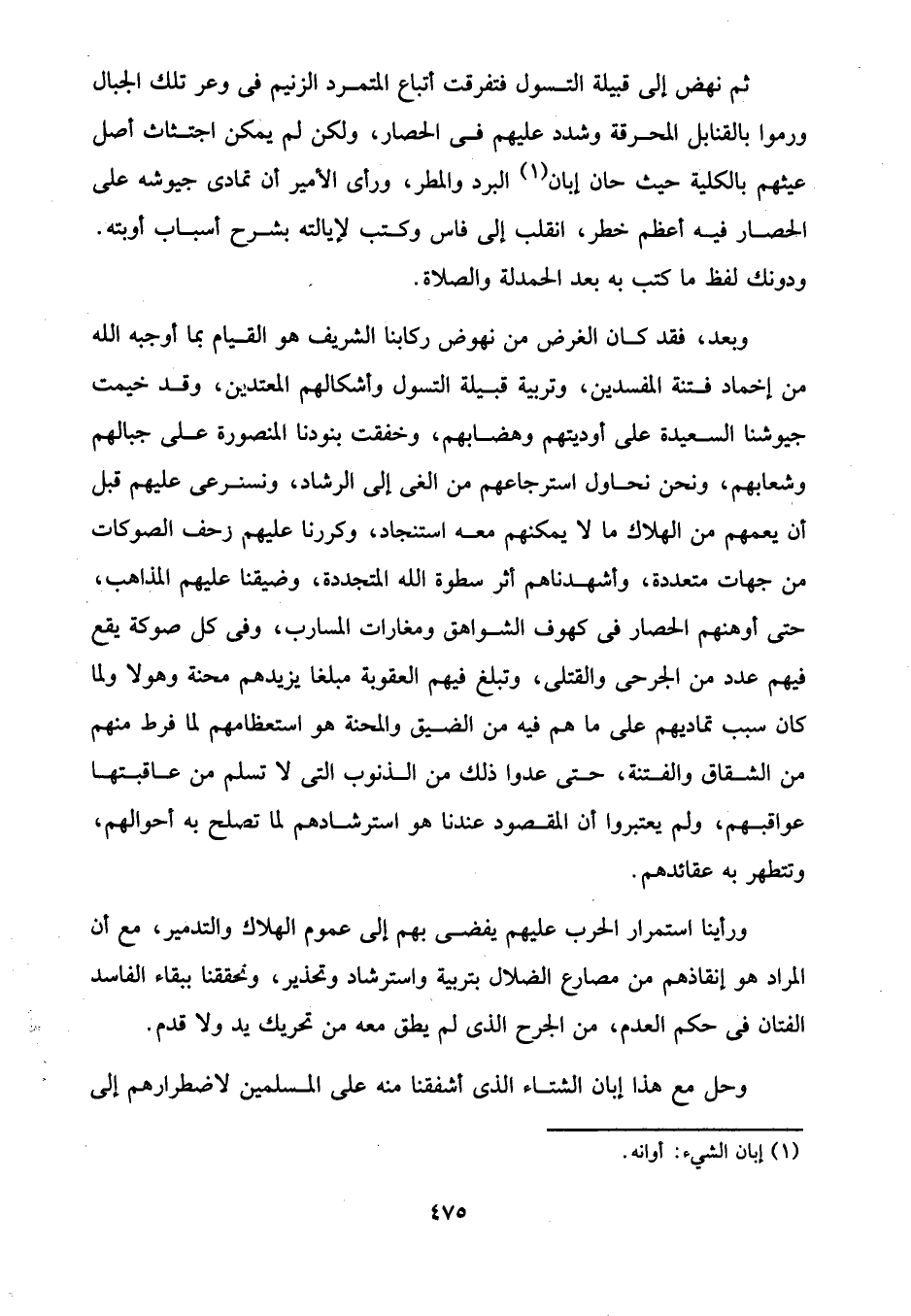 وبعد، فقد كان الغرض من نهوض ركابنا الشريف هو القيام بما أوجبه الله من إخماد فتنة المفسدين، وتربية قبيلة التسول وأشكالهم المعتدين، وقد خيمت جيوشنا السعيدة على أوديتهم وهضابهم، وخفقت بنودنا المنصورة على جبالهم وشعابهم، ونحن نحاول استرجاعهم من الغى إلى الرشاد، ونسترعى عليهم قبل أن يعمهم من الهلاك ما لا يمكنهم معه استنجاد، وكررنا عليهما زحف الصوكات من جهات متعددة، وأشهدناهم أثر سطوة الله المتجددة، وضيقنا عليهم المذاهب، حتى أوهنهم الحصار في كهوف الشواهق ومغارات المسارب، وفي كل صوكة يقع فيهم عدد من الجرحى والقتلى، وتبلغ فيهم العقوبة مبلغا يزيدهم محنة وهولا ولما كان سبب تماديهم على ما هم فيه من الضيق والمحنة هو استعظامهم لما فرط منهم من الشقاق والفتنة، حتى عدوا ذلك من الذنوب التي لا تسلم من عاقبتها عواقبهم، ولم يعتبروا أن المقصود عندنا هو استرشادهم لما تصلح به أحوالهم، وتتطهر به عقائدهم.