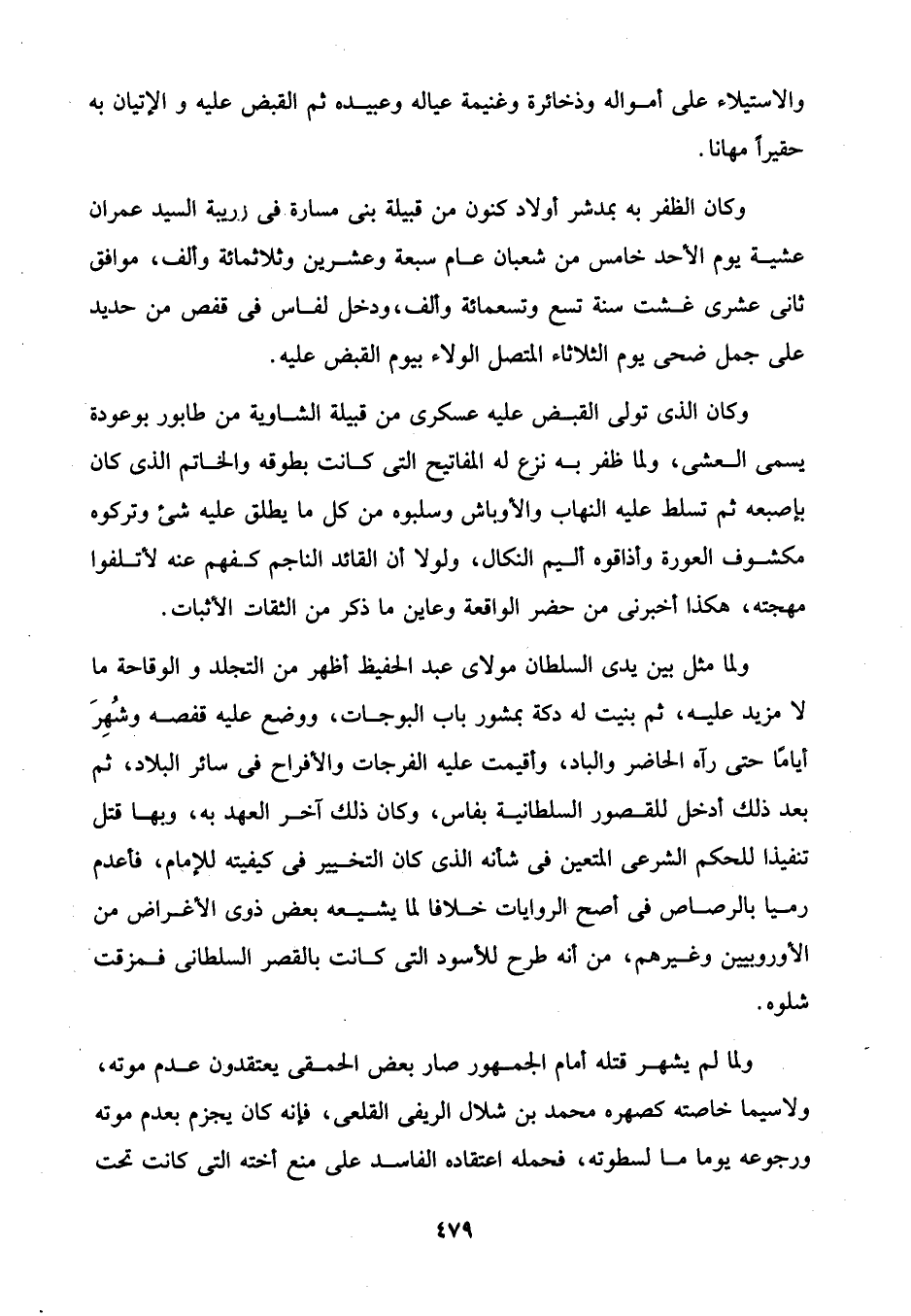 وكان الذي تولى القبض عليه عسكرى من قبيلة الشاوية من طابور بوعودة يسمى العشى، ولما ظفر به نزع له المفاتيح التي كانت بطوقه والخاتم الذي كان بإصبعه ثم تسلط عليه النهاب والأوباش وسلبوه من كل ما يطلق عليه شيء وتركوه مكشوف العورة وأذاقوه أليم النكال، ولولا أن القائد الناجم كفهم عنه لأتلفوا مهجته، هكذا أخبرنى من حضر الواقعة وعاين ما ذكر من الثقات الأثبات.