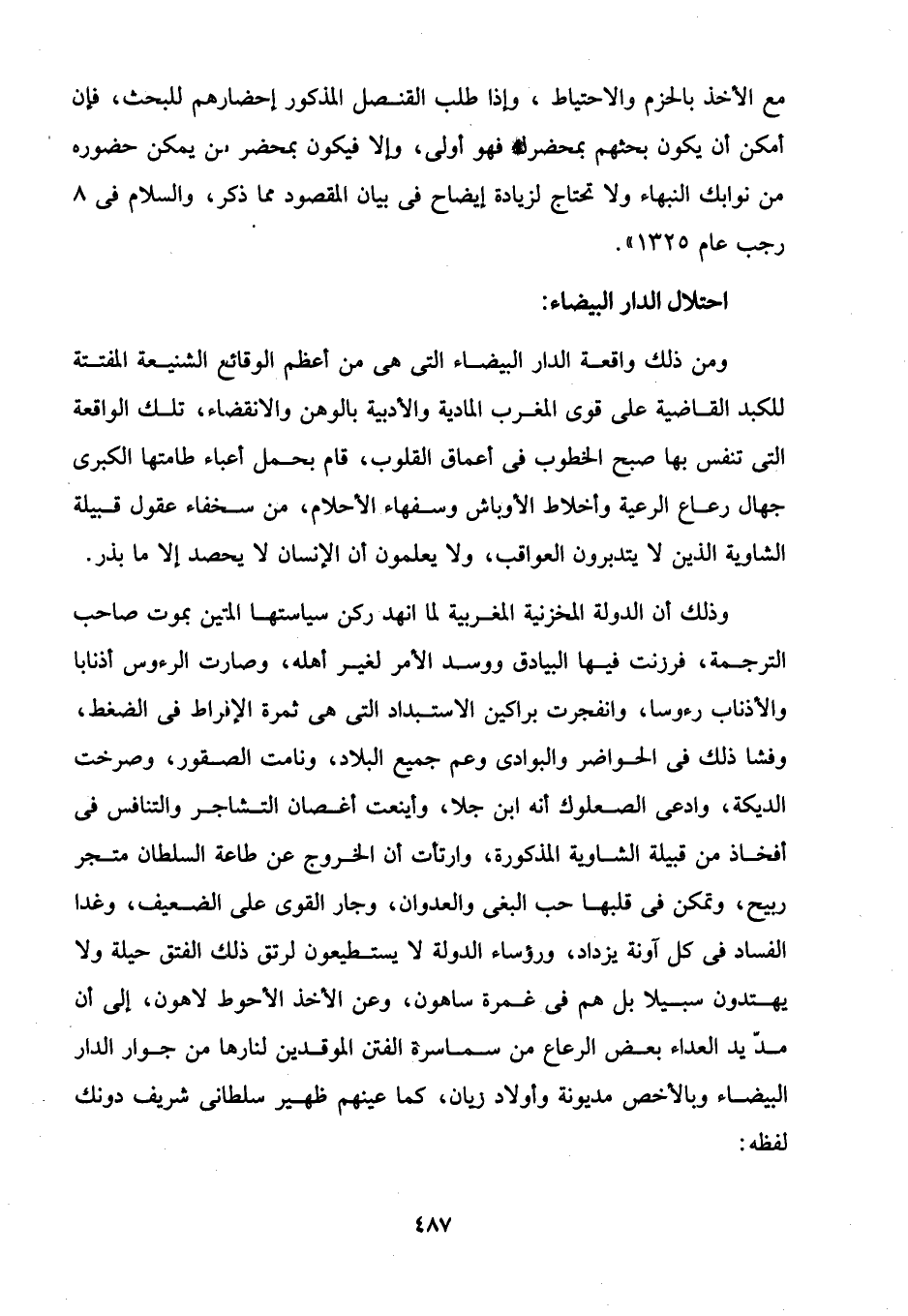 ومن ذلك واقعة الدار البيضاء التي هي من أعظم الوقائع الشنيعة المفتتة للكبد القاضية على قوى المغرب المادية والأدبية بالوهن والانقضاء، تلك الواقعة التي تنفس بها صبح الخطوب في أعماق القلوب، قام بحمل أعباء طامتها الكبرى جهال رعاع الرعية وأخلاط الأوباش وسفهاء الأحلام، من سخفاء عقول قبيلة الشاوية الذين لا يتدبرون العواقب، ولا يعلمون أن الإنسان لا يحصد إلا ما بذر.