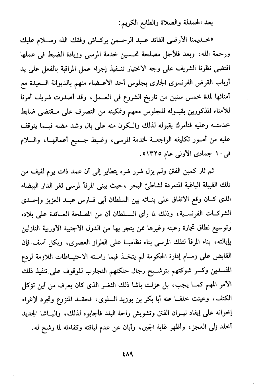 "خديمنا الأرضى القائد عبد الرحمن بركاش وفقك الله وسلام عليك ورحمة الله، وبعد فلأجل مصلحة تحسين خدمة المرسى وزيادة الضبط في عملها اقتضى نظرنا الشريف على وجه الاختيار تنفيذ إجراء عمل المراقبة بالفعل على يد أرباب القرض الفرنسوى البخاري بجلوس أحد الأعضاء منهم بالديوانة السعيدة مع أمنائها لمدة خمس سنين من تاريخ الشروع في العمل، وقد أصدرت شريف أمرنا للأمناء المذكورين بقبوله للجلوس معهم وتمكينه من التصرف على مقتضى ضابط خدمته وعليه فنأمرك بقبوله لذلك والكون منه على بال وشد عضه فيما يتوقف عليه من أمور تكليفه الراجعة لخدمة المرسى، وضبط جميع أعمالها، والسلام في 10 جمادى الأولى عام 1325".