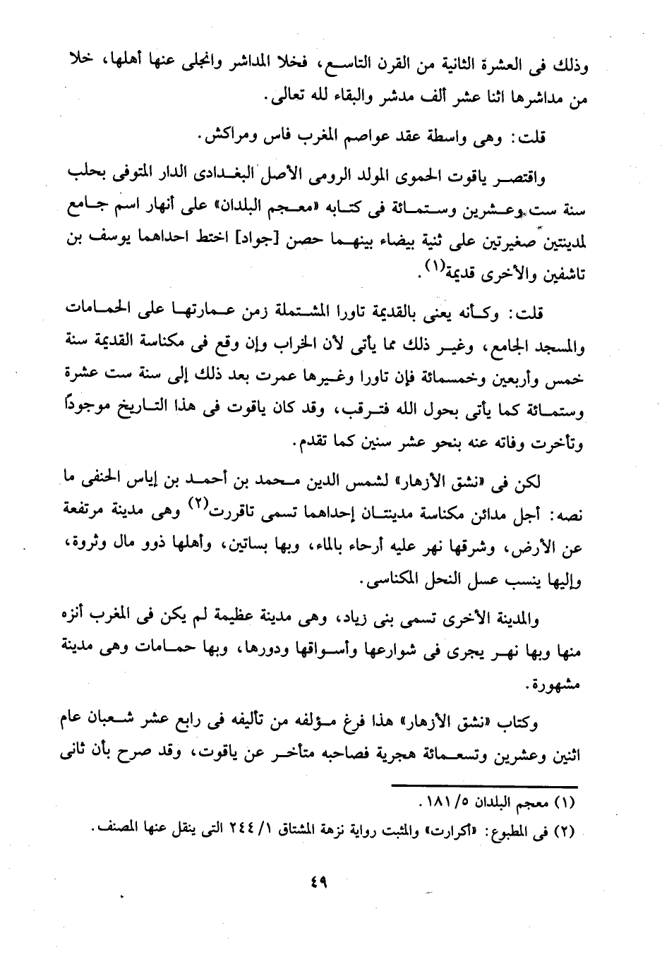 قلت: وكأنه يعنى بالقديمة تاورا المشتملة زمن عمارتها على الحمامات والمسجد الجامع، وغير ذلك مما يأتى لأن الخراب وإن وقع في مكناسة القديمة سنة خمس وأربعين وخمسمائة فإن تاورا وغيرها عمرت بعد ذلك إلى سنة ست عشرة وستمائة كما يأتى بحول الله فترقب، وقد كان ياقوت في هذا التاريخ موجودًا وتأخرت وفاته عنه بنحو عشر سنين كما تقدم.