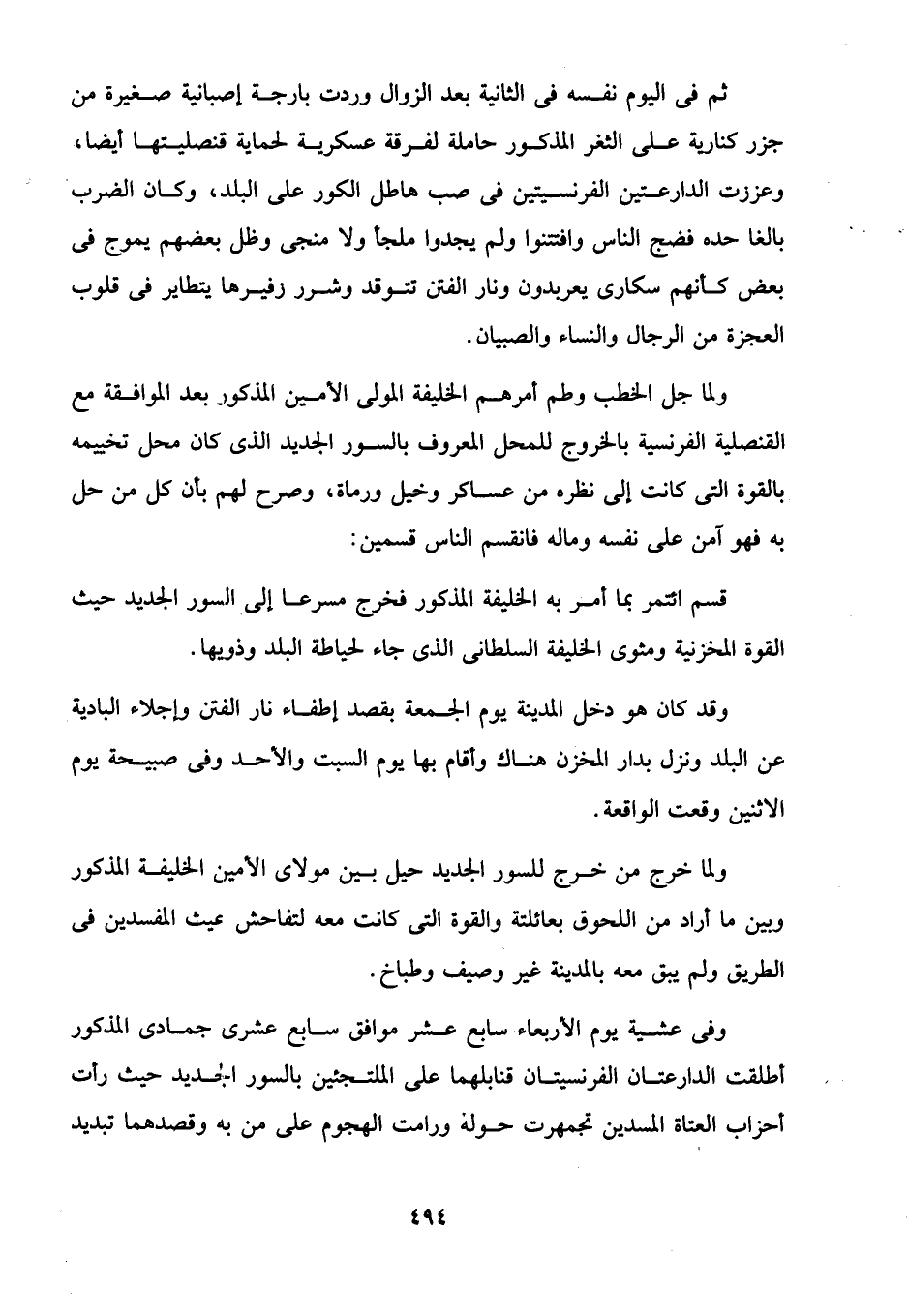 ولما خرج من خرج للسور الجديد حيل بين مولاى الأمير، الخليفة المذكور وبين ما أراد من اللحوق بعائلتة والقوة التي كانت معه لتفاحش عيث المفسدين في الطريق ولم يبق معه بالمدينة غير وصيف وطباخ.