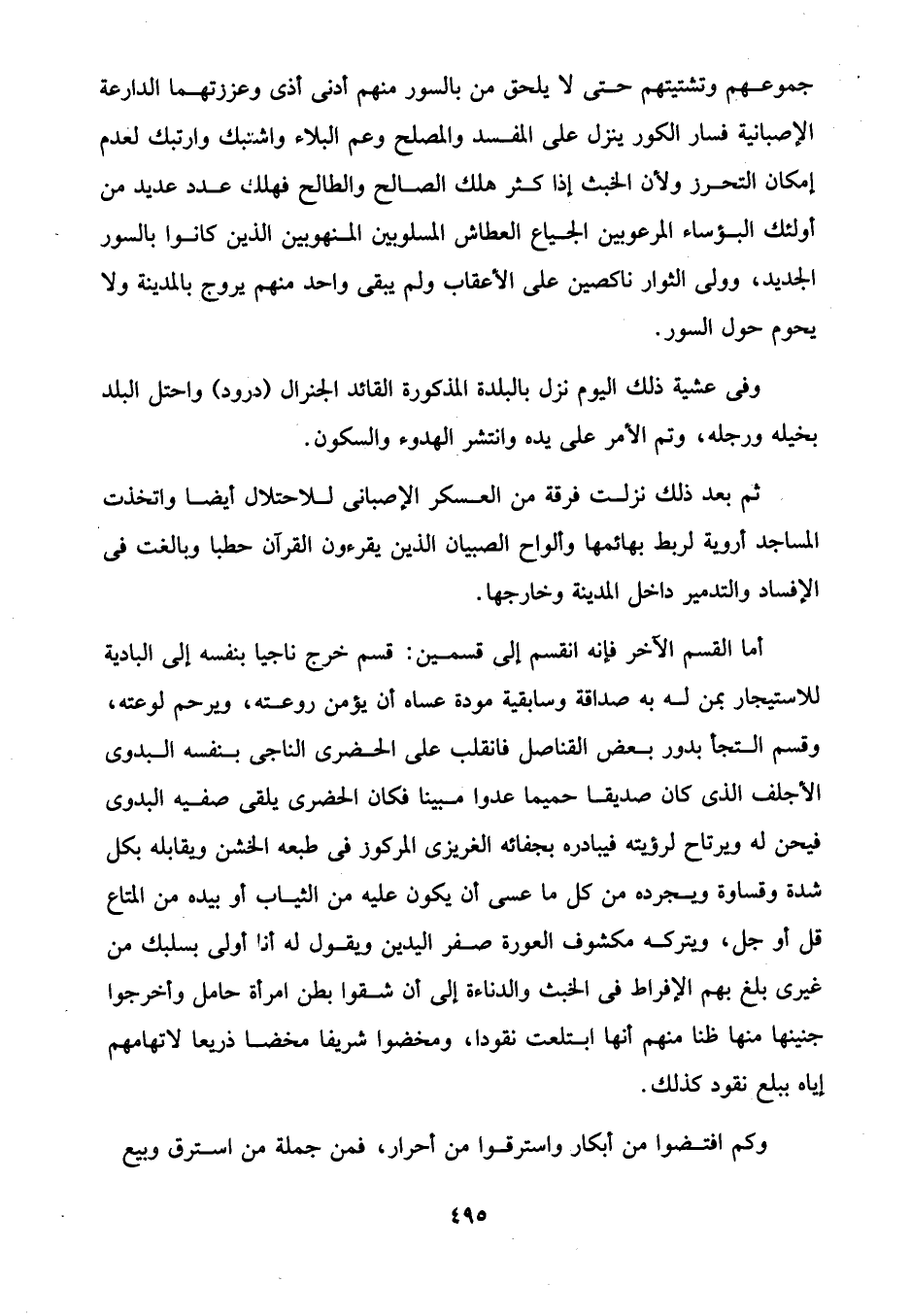 ثم بعد ذلك نزلت فرقة من العسكر الإصبانى للاحتلال أيضًا واتخذت المساجد أروية لربط بهائمها وألواح الصبيان الذين يقرءون القرآن حطبا وبالغت في الإفساد والتدمير داخل المدينة وخارجها.