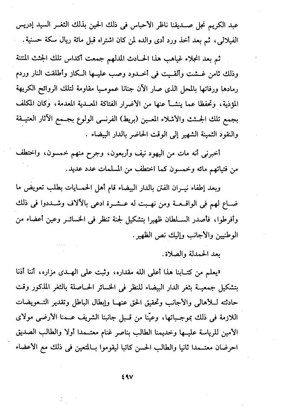 "يعلم من كتابنا هذا أعلى الله مقداره، وثبت على الهدى مزاره، أننا أذنا بتشكيل جمعية بثغر الدار البيضاء للنظر في الخسائر الحاصلة بالثغر المذكور وقت حادثته للأهالى والأجانب وتحقيق الحق عنها وإبطال الباطل وتقدير التعويضات اللازمة في ذلك بموجباتها، وعيّنا من قبل جانبنا الشريف عمنا الأرضى مولاى الأمين للرياسة عليها وخديمنا الطالب بناصر غنام معتمدا أولا والطالب الصديق احرضان معتمدا ثانيا والطالب الحسن كاتبا ليقوموا بالمتعين في ذلك مع الأعضاء