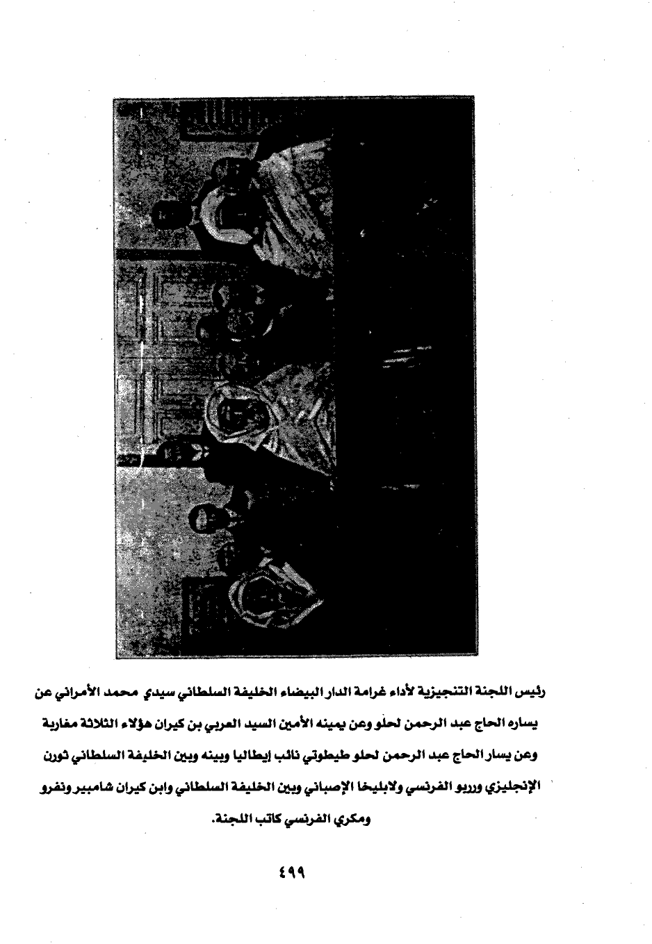 رئيس اللجنة التنجيزية لأداء غرامة الدار البيضاء الخليفة السلطاني سيدي محمَّد الأمراني عن يساره الحاج عبد الرحمن لحلو وعن يمينه الأمين السيد العربي بن كيران هؤلاء الثلاثة مغاربة وعن يسار الحاج عبد الرحمن لحلو طيطوتي نائب إيطاليا وبينه ويين الخليفة السلطاني ثورن الإنجليزي ورريو الفرنسي ولابليخا الإصباني وبين الخليفة السلطاني وابن كيران شامبير ذونفرو ومكى الفرنسي كاتب اللجنة.