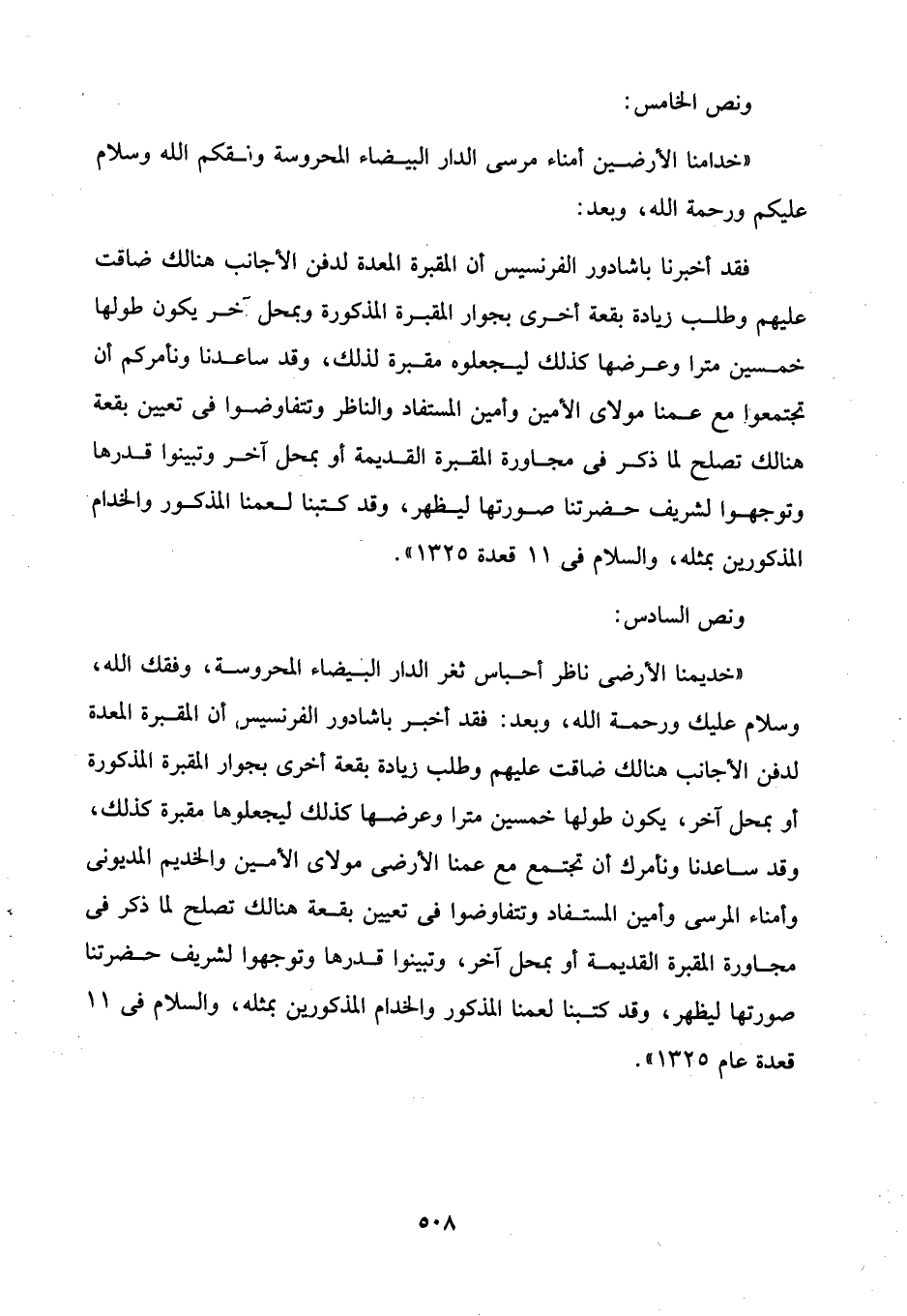 "خديمنا الأرضى ناظر أحباس ثغر الدار البيضاء المحروسة، وفقك الله، وسلام عليك ورحمة الله، وبعد: فقد أخبر باشادور الفرنسيس أن المقبرة المعدة لدفن الأجانب هنالك ضاقت عليهم وطلب زيادة بقعة أخرى بجوار المقبرة المذكورة أو بمحل آخر، يكون طولها خمسين مترا وعرضها كذلك ليجعلوها مقبرة كذلك، وقد ساعدنا ونأمرك أن تجتمع مع عمنا الأرضى مولاى الأمين والخديم المديونى وأمناء المرسى وأمين المستفاد وتتفاوضوا في تعيين بقعة هنالك تصلح لما ذكر في مجاورة المقبرة القديمة أو بمحل آخر، وتبينوا قدرها وتوجهوا لشريف حضرتنا صورتها ليظهر، وقد كتبنا لعمنا المذكور والخدام المذكورين بمثله، والسلام في 11 قعدة عام 1325".