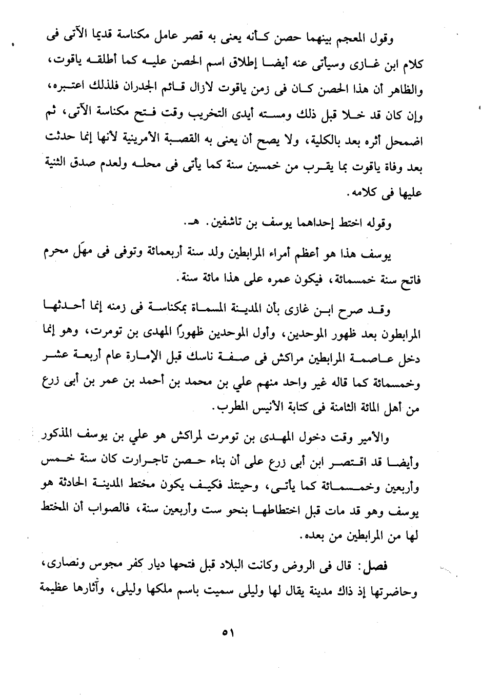 والأمير وقت دخول المهدى بن تومرت لمراكش هو علي بن يوسف المذكور، وأيضا قد اقتصر ابن أبى زرع على أن بناء حصن تاجرارت كان سنة خمس وأربعين وخمسمائة كما يأتى، وحينئذ فكيف يكون مختط المدينة الحادثة هو يوسف وهو قد مات قبل اختطاطها بنحو ست وأربعين سنة، فالصواب أن المختط لها من المرابطين من بعده.