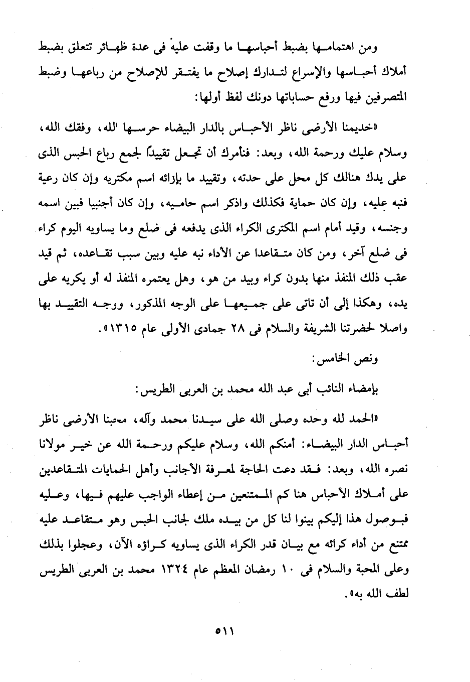 "الحمد لله وحده وصلى الله على سيدنا محمد وآله، محبنا الأرضى ناظر أحباس الدار البيضاء: أمنكم الله، وسلام عليكم ورحمة الله عن خير مولانا نصره الله، وبعد: فقد دعت الحاجة لمعرفة الأجانب وأهل الحمايات المتقاعدين على أملاك الأحباس هنا كم الممتنعين من إعطاء الواجب عليهم فيها، وعليه فبوصول هذا إليكم بينوا لنا كل من بيده ملك لجانب الحبس وهو متقاعد عليه ممتنع من أداء كرائه مع بيان قدر الكراء الذى يساويه كراؤه الآن، وعجلوا بذلك وعلى المحبة والسلام في 10 رمضان المعظم عام 1324 محمد بن العربى الطريس لطف الله به".