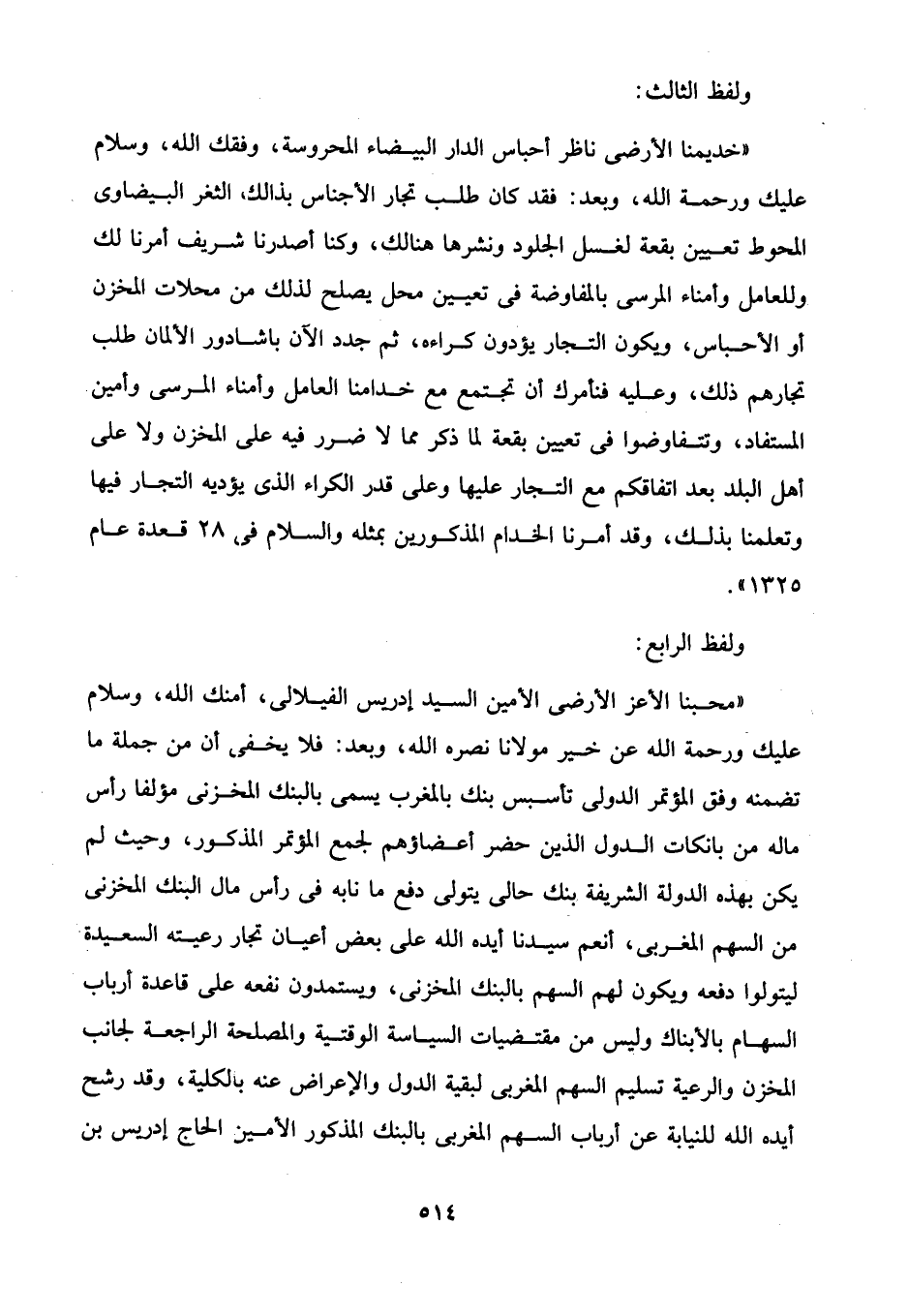 "محبنا الأعز الأرضى الأمين السيد إدريس الفيلالى، أمنك الله، وسلام عليك ورحمة الله عن خير مولانا نصره الله، وبعد: فلا يخفر، أن من جملة ما تضمنه وفق المؤتمر الدولى تأسيس بنك بالمغرب يسمى بالبنك المخزنى مؤلفا رأس ماله من بانكات الدول الذين حضر أعضاؤهم لجمع المؤتمر المذكور، وحيث لم يكن بهذه الدولة الشريفة بنك حالى يتولى دفع ما نابه في رأس مال البنك المخزنى من السهم المغربى، أنعم سيدنا أيده الله على بعض أعيان تجار رعيته السعيدة ليتولوا دفعه ويكون لهم السهم بالبنك المخزنى، ويستمدون نفعه على قاعدة أرباب السهام بالأبناك وليس من مقتضيات السياسة الوقتية والمصلحة الراجعة لجانب المخزن والرعية تسليم السهم المغربى لبقية الدول والإعراض عنه بالكلية، وقد رشح أيده الله للنيابة عن أرباب السهم المغربى بالبنك المذكور الأمين الحاج إدريس بن