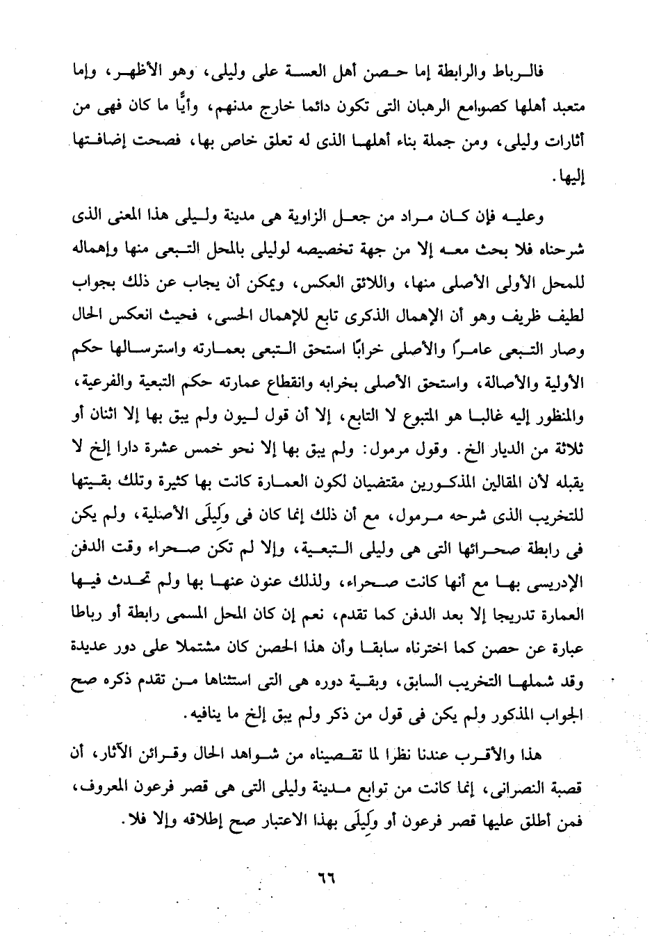 وعليه فإن كان مراد من جعل الزاوية هى مدينة وليلى هذا المعنى الذى شرحناه فلا بحث معه إلا من جهة تخصيصه لوليلى بالمحل التبعى منها وإهماله للمحل الأولى الأصلى منها، واللائق العكس، ويمكن أن يجاب عن ذلك بجواب لطيف ظريف وهو أن الإهمال الذكرى تابع للإهمال الحسى، فحيث انعكس الحال وصار التبعى عامرًا والأصلى خرابًا استحق التبعى بعمارته واسترسالها حكم الأولية والأصالة، واستحق الأصلى بخرابه وانقطاع عمارته حكم التبعية والفرعية، والمنظور إليه غالبا هو المتبوع لا التابع، إلا أن قول ليون ولم يبق بها إلا اثنان أو ثلاثة من الديار الخ. وقول مرمول: ولم يبق بها إلا نحو خمس عشرة دارا إلخ لا يقبله لأن المقالين المذكورين مقتضيان لكون العمارة كانت بها كثيرة وتلك بقيتها للتخريب الذى شرحه مرمول، مع أن ذلك إنما كان في وَلِيلَى الأصلية، ولم يكن في رابطة صحرائها التي هى وليلى التبعية، وإلا لم تكن صحراء وقت الدفن الإدريسى بها مع أنها كانت صحراء، ولذلك عنون عنها بها ولم تحدث فيها العمارة تدريجا إلا بعد الدفن كما تقدم، نعم إن كان المحل المسمى رابطة أو رباطا عبارة عن حصن كما اخترناه سابقا وأن هذا الحصن كان مشتملا على دور عديدة وقد شملها التخريب السابق، وبقية دوره هى التي استثناها من تقدم ذكره صح الجواب المذكور ولم يكن في قول من ذكر ولم يبق إلخ ما ينافيه.