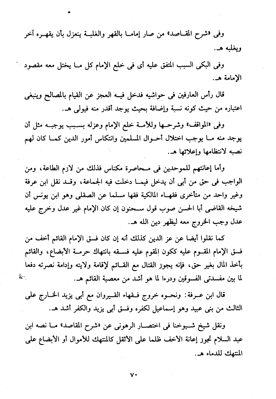 وفى "المواقف" وشرحها وللأمة خلع الإمام وعزله بسبب يوجبه مثل أن يوجد منه ما يوجب اختلال أحوال المسلمين وانتكاس أمور الدين كما كان لهم نصبه لانتظامها وإعلائها هـ.