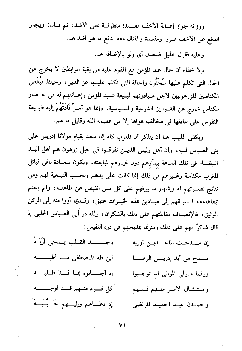 ويكفى اللبيب هنا أن يتذكر أن المغرب كله إنما سعد بقيام مولانا إدريس على بنى العباس فيه، وأن أهل وليلى الذين تفرقوا في جبل زرهون هم أهل اليد البيضاء في تلك الساعة بِبِدَارِهم دون غيرهم لمبايعته، وبكون سعادة باقى قبائل المغرب مكناسة وغيرهم في ذلك إنما كانت على يدهم وبحسب التبعية لهم ومن نتائج نصرتهم له وإشهار سيوفهم على كل من انقبض عن طاعته، ولم يحتم بمعاهدته، فسبقهم إلى ميادين هذه الخيرات عتيق، وقديما آووا منه إلى الركن الوثيق، فالإنصاف مقابلتهم على ذلك بالشكران، ولله در أبى العباس الحلبى إذ قال شاكرًا لهم على ذلك ومترنما بمديحهم في دره النفيس: