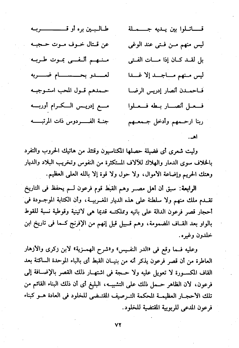 الرابعة: سبق أن أهل مصر وهم القبط قوم فرعون لم يحفظ في التاريخ تقدم ملك منهم ولا سلطنة على هذه الديار المغربية، وأن الكتابة الموجودة في أحجار قصر فرعون الدالة على بانيه ومملكته قديما هى لاتينية وقوطية نسبة للقوط بالواو بعد القاف المضمومة، وهم قبيل قيل إنهم من الإفرنج كما في تاريخ ابن خلدون وغيره.