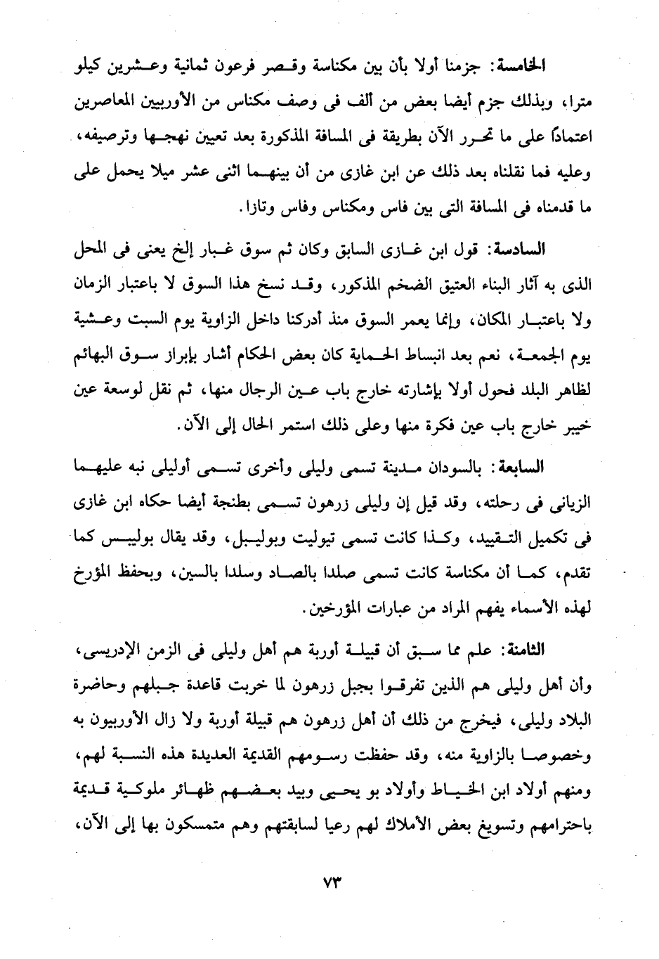 السابعة: بالسودان مدينة تسمى وليلى وأخرى تسمى أوليلى نبه عليهما الزيانى في رحلته، وقد قيل إن وليلى زرهون تسمى بطنجة أيضا حكاه ابن غازى في تكميل التقييد، وكذا كانت تسمى تيوليت وبوليبل، وقد يقال بوليبس كما تقدم، كما أن مكناسة كانت تسمى صلدا بالصاد وسلدا بالسين، وبحفظ المؤرخ لهذه الأسماء يفهم المراد من عبارات المؤرخين.