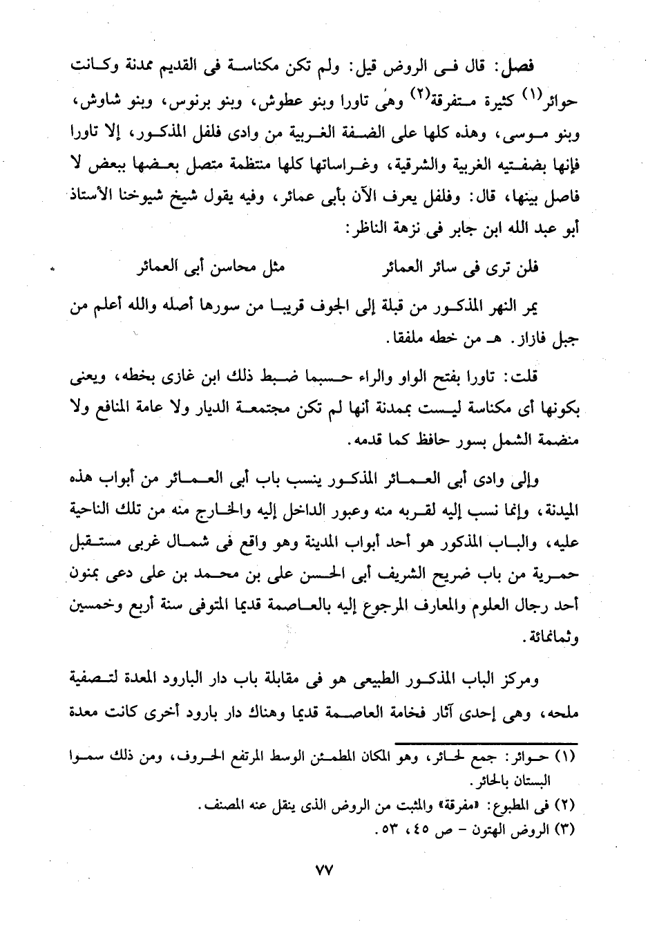 فصل: قال في الروض قيل: ولم تكن مكناسة في القديم ممدنة وكانت حوائر (¬1) كثيرة متفرقة (¬2) وهى تاورا وبنو عطوش، وبنو برنوس، وبنو شاوش، وبنو موسى، وهذه كلها على الضفة الغربية من وادى فلفل المذكور، إلا تاورا فإنها بضفتيه الغربية والشرقية، وغراساتها كلها منتظمة متصل بعضها ببعض لا فاصل بينها، قال: وفلفل يعرف الآن بأبى عمائر، وفيه يقول شيخ شيوخنا الأستاذ أبو عبد الله ابن جابر في نزهة الناظر: