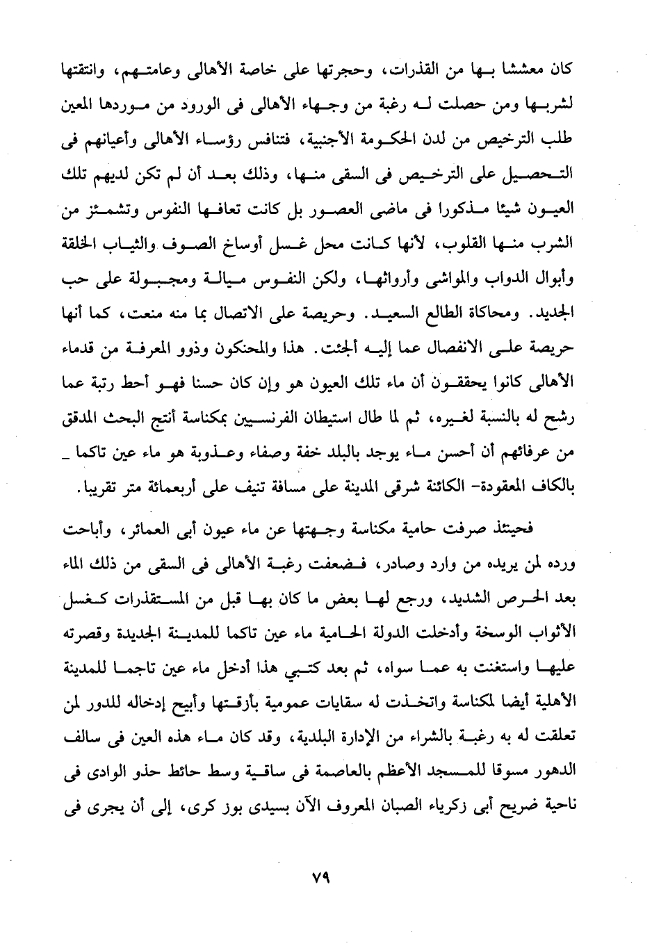 فحينئذ صرفت حامية مكناسة وجهتها عن ماء عيون أبى العمائر، وأباحت ورده لمن يريده من وارد وصادر، فضعفت رغبة الأهالى في السقى من ذلك الماء بعد الحرص الشديد، ورجع لها بعض ما كان بها قبل من المستقذرات كغسل الأثواب الوسخة وأدخلت الدولة الحامية ماء عين تاكما للمدينة الجديدة وقصرته عليها واستغنت به عما سواه، ثم بعد كتبي هذا أدخل ماء عين تاجما للمدينة الأهلية أيضا لمكناسة واتخذت له سقايات عمومية بأزقتها وأبيح إدخاله للدور لمن تعلقت له به رغبة بالشراء من الإدارة البلدية، وقد كان ماء هذه العين في سالف الدهور مسوقا للمسجد الأعظم بالعاصمة في ساقية وسط حائط حذو الوادى في ناحية ضريح أبى زكرياء الصبان المعروف الآن بسيدى بوز كرى، إلى أن يجرى في