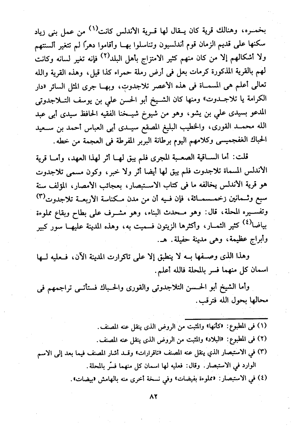 قلت: أما الساقية الصعبة المجرى فلم يبق لها أثر لهذا العهد، وأما قرية الأندلس المسماة تلاجدوت فلم يبق لها أيضا أثر ولا خبر، وكون مسمى تلاجدوت هو قرية الأندلس يخالفه ما في كتاب الاستبصار، بعجائب الأمصار، المؤلف سنة سبع وثمانين وخمسمائة، فإن فيه أن من مدن مكناسة الأربعة تلاجدوت (¬3) وتفسيره المحلة، قال: وهو محدث البناء، وهو مشرف على بطاح وبقاع مملوءة بياضا (¬4) كثير الثمار، وأكثرها الزيتون فسميت به، وهذه المدينة عليها سور كبير وأبراج عظيمة، وهى مدينة حفيلة. هـ.