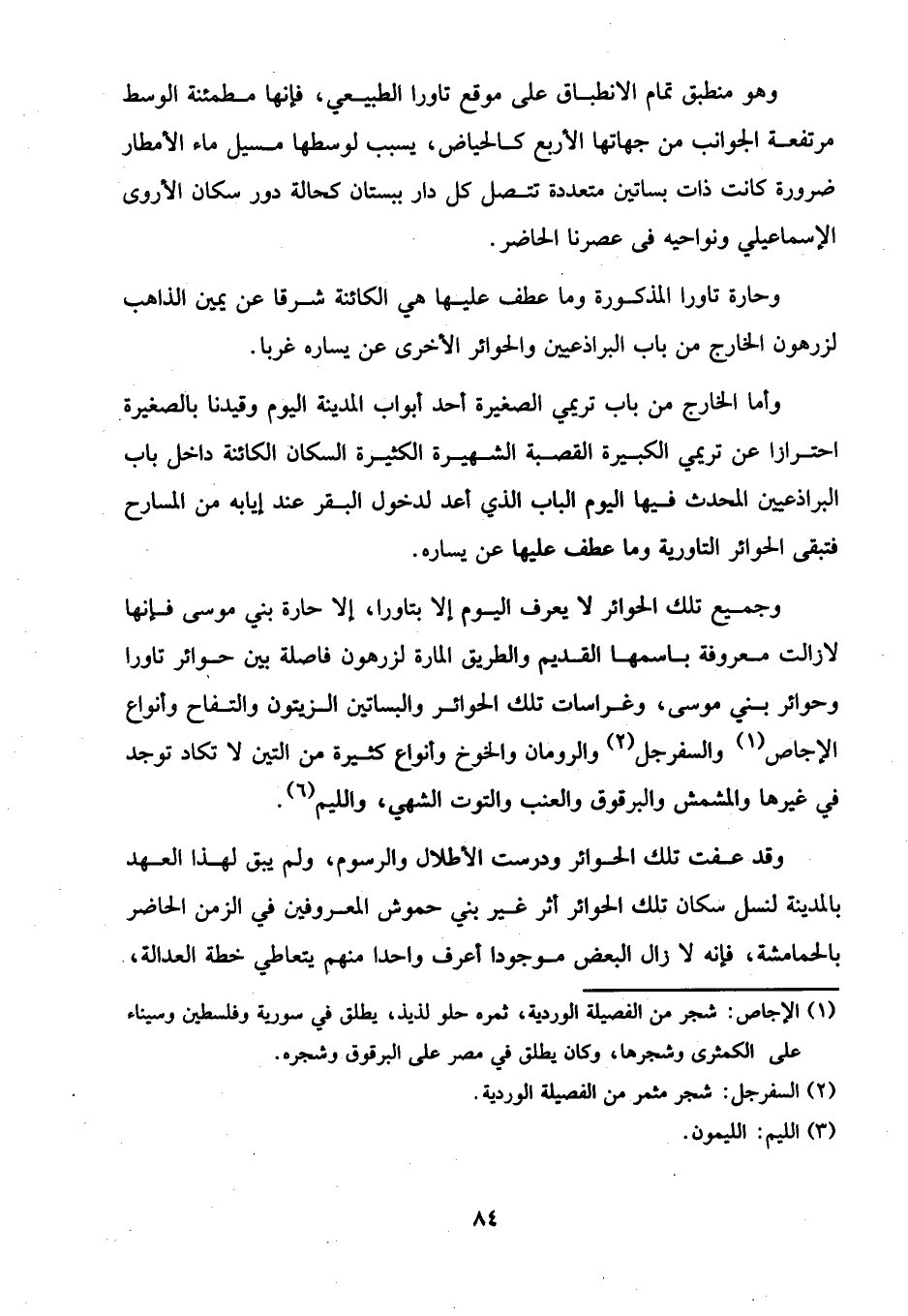 وجميع تلك الحوائر لا يعرف اليوم إلا بتاورا، إلا حارة بني موسى فإنها لازالت معروفة باسمها القديم والطريق المارة لزرهون فاصلة بين حوائر تاورا وحوائر بني موسى، وغراسات تلك الحوائر والبساتين الزيتون والتفاح وأنواع الإجاص (¬1) والسفرجل (¬2) والرومان والخوخ وأنواع كثيرة من التين لا تكاد توجد في غيرها والمشمش والبرقوق والعنب والتوت الشهي، والليم (¬3).