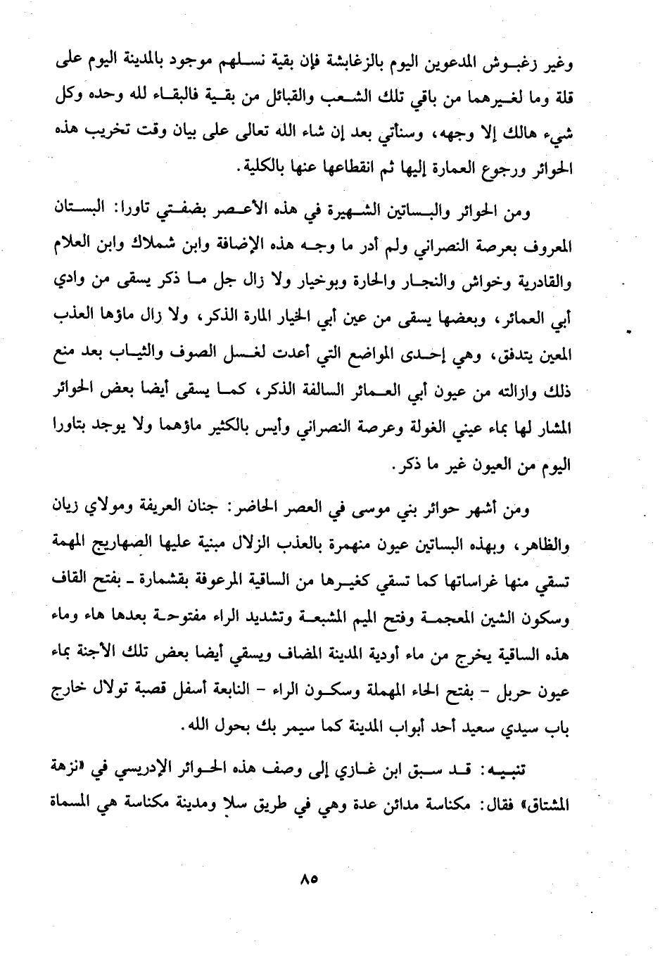 ومن أشهر حوائر بني موسى في العصر الحاضر: جنان العريفة ومولاي زيان والظاهر، وبهذه البساتن عيون منهمرة بالعذب الزلال مبنية عليها الصهاريج المهمة تسقي منها غراساتها كما تسقي كغيرها من الساقية المرعوفة بقشمارة -بفتح القاف وسكون الشين المعجمة وفتح الميم المشبعة وتشديد الراء مفتوحة بعدها هاء وماء هذه الساقية يخرج من ماء أودية المدينة المضاف ويسقي أيضا بعض تلك الأجنة بماء عيون حربل -بفتح الحاء المهملة وسكون الراء- النابعة أسفل قصبة تولال خارج باب سيدي سعيد أحد أبواب المدينة كما سيمر بك بحول الله.