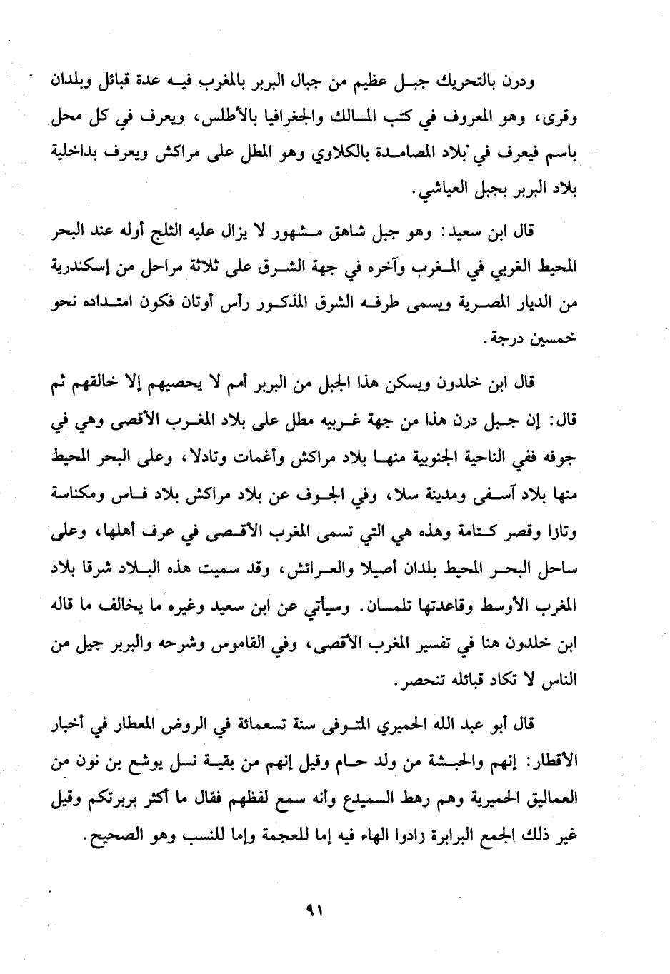 قال ابن خلدون ويسكن هذا الجبل من البربر أمم لا يحصيهم إلا خالقهم ثم قال: إن جبل درن هذا من جهة غربيه مطل على بلاد المغرب الأقصى وهي في جوفه ففي الناحية الجنوبية منها بلاد مراكش وأغمات وتادلا، وعلى البحر المحيط منها بلاد آسفى ومدينة سلا، وفي الجوف عن بلاد مراكش بلاد فاس ومكناسة وتازا وقصر كتامة وهذه هي التي تسمى المغرب الأقصى في عرف أهلها، وعلى ساحل البحر المحيط بلدان أصيلا والعرائش، وقد سميت هذه البلاد شرقا بلاد المغرب الأوسط وقاعدتها تلمسان. وسيأتي عن ابن سعيد وغيره ما يخالف ما قاله ابن خلدون هنا في تفسير المغرب الأقصى، وفي القاموس وشرحه والبربر جيل من الناس لا تكاد قبائله تنحصر.