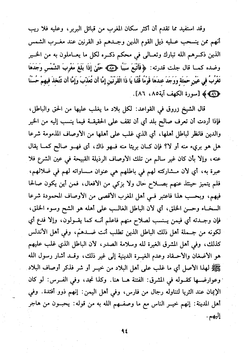 قال الشيخ زروق في القواعد: لكل بلاد ما يغلب عليها من الحق والباطل، فإذا أردت أن تعرف صالح بلد أي أن تقف على الحقيقة فيما ينسب إليه من الخير والدين فانظر لباطل أهلها، أي الذي غلب على أهلها من الأوصاف المذمومة شرعا هل هو بريء منه أو لا؟ فإن كان بريئا منه فهو ذاك، أى فهو صالح كما يقال عنه، وإلا بأن كان غير سالم من تلك الأوصاف الرذيلة القبيحة في عين الشرع فلا عبرة به، أي لأن مشاركته لهم في باطلهم هي عنوان مساواته لهم في ضلالهم، فلم يتميز حينئذ عنهم بصلاح حال ولا بزكي من الأفعال، فمن أين يكون صالحا فيهم، وبحسب هذا فاعتبر في أهل المغرب الأقصى من الأوصاف المحمودة شرعا السخاء وحسن الخلق، أي لأن الباطل الغالب على أهله هو الشح وسوء الخلق، فإن وجدته أي فيمن ينسب لصلاح منهم فاعلم أنه كما يقولون، وإلا فدع أي لكونه من جملة أهل ذلك الباطل الذين تطلب أنت ضدهم، وفي أهل الأندلس كذلك، وفي أهل المشرق الغيرة لله وسلامة الصدر، لأن الباطل الذي غلب عليهم هو الأضغان والأحقاد وعدم الغيرة الدينية إلى غير ذلك، وقد أشار رسول الله - صلى الله عليه وسلم - لهذا الأصل أي ما غلب على أهل البلاد من خير أو شر فذكر أوصاف البلاد. وعوارضها كقوله في المشرق: الفتنة ها هنا. وكذا نجد، وفي الفرس: لو كان الإيمان عند الثريا لتناوله رجال من فارس، وفي أهل اليمن: إنهم ذوو أفئدة. وفي أهل المدينة: إنهم خير الناس مع ما وصفهم الله به من قوله: يحبون من هاجر إليهم.
