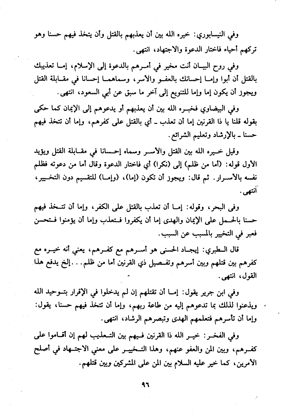 وفي ابن جرير يقول: إما أن تقتلهم إن لم يدخلوا في الإقرار بتوحيد الله ويذعنوا لذلك بما تدعوهم إليه من طاعة ربهم، وإما أن تتخذ فيهم حسنا، يقول: وإما أن تأسرهم فتعلمهم الهدى وتبصرهم الرشاد، انتهى.