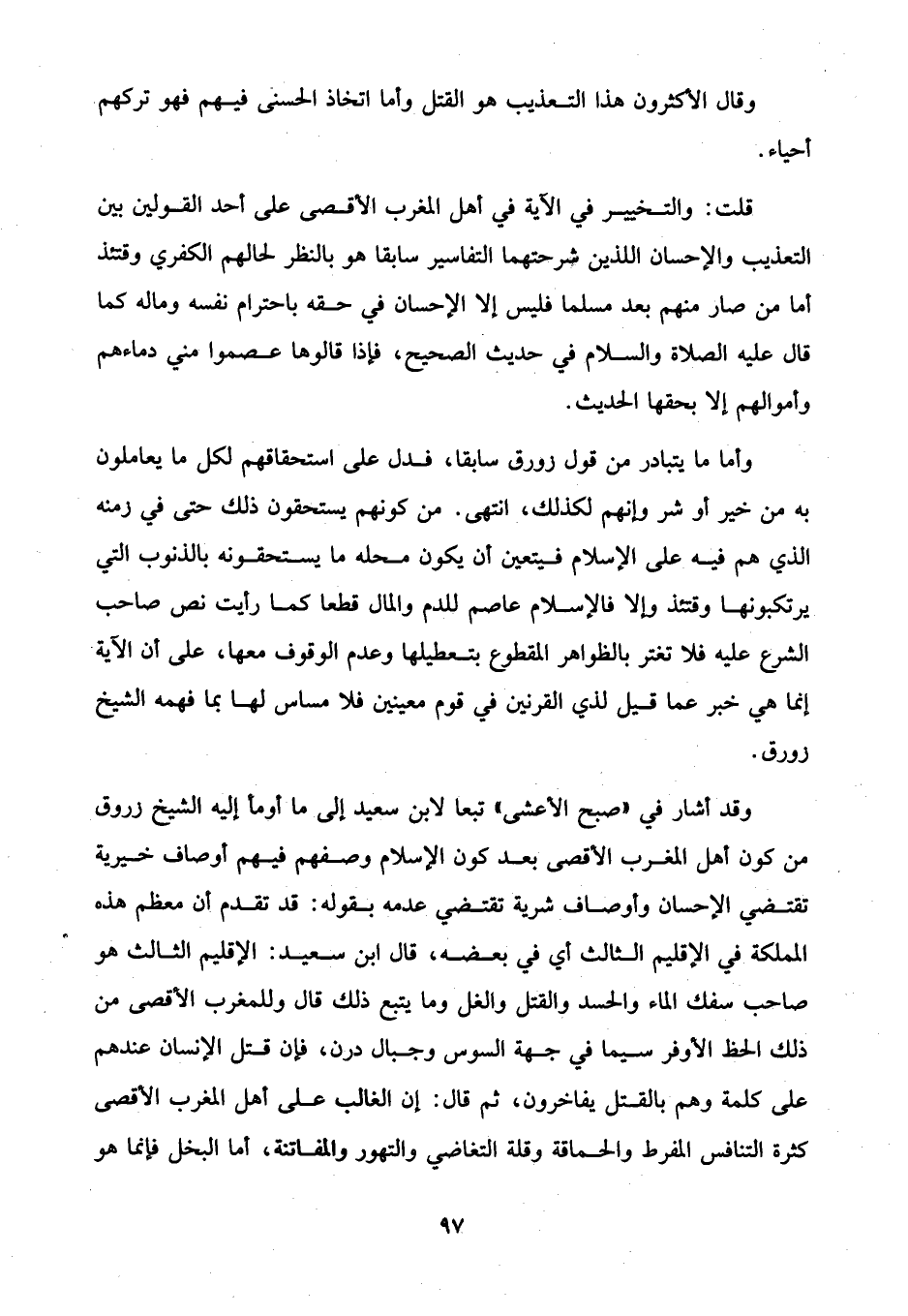 وقد أشار في "صبح الأعشى" تبعا لابن سعيد إلى ما أومأ إليه الشيخ زروق من كون أهل المغرب الأقصى بعد كون الإسلام وصفهم فيهم أوصاف خيرية تقتضي الإحسان وأوصاف شرية تقتضي عدمه بقوله: قد تقدم أن معظم هذه المملكة في الإقليم الثالث أي في بعضه، قال ابن سعيد: الأقليم الثالث هو صاحب سفك الماء والحسد والقتل والغل وما يتبع ذلك قال وللمغرب الأقصى من ذلك الحظ الأوفر سيما في جهة السوس وجبال درن، فإن قتل الإنسان عندهم على كلمة وهم بالقتل يفاخرون، ثم قال: إن الغالب على أهل المغرب الأقصى كثرة التنافس المفرط والحماقة وقلة التغاضي والتهور والمفاتنة، أما البخل فإنما هو