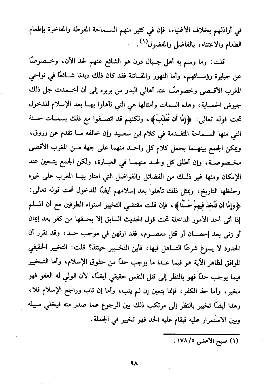 قلت: وما وسم به أهل جبال درن هو الشائع عنهم لحد الآن، وخصوصًا عن جبابرة رؤسائهم، وأما التهور والمفاتنة فقد كان ذلك ديدنا شائعًا في نواحي المغرب الأقصى وخصوصًا عند أهالي البدو من بربره إلى أن أخمدت جل ذلك جيوش الحماية، وهذه السمات وأمثالها هي التي تأهلوا بها بعد الإسلام للدخول تحت قوله تعالى: {إِمَّا أَنْ تُعَذِّبَ}، ولكنهم قد اتصفوا مع ذلك بسمات حسنة التي منها السماحة المتقدمة في كلام ابن سعيد وإن خالفه ما تقدم عن زروق، ويمكن الجمع بينهما بحمل كلام كل واحد منهما على جهة من المغرب الأقصى مخصوصة، وإن أطلق كل واحد منهما في العبارة، ولكن الجمع يتعين عند الإمكان ومنها غير ذلك من الفضائل والفواضل التي امتاز بها المغرب على غيره وحفظها التاريخ، وبمثل ذلك تأهلوا بعد إسلامهم أيضًا للدخول تحت قوله تعالى: {وَإِمَّا أَنْ تَتَّخِذَ فِيهِمْ حُسْنًا}، فإن قلت مقتضي التخيير استواء الطرفين مع أن المسلم إذا أتى أحد الأمور الداخلة تحت قول الحديث السابق إلا بحقها من كفر بعد إيمان أو زنى بعد إحصان أو قتل معصوم، فقد ارتهن في موجب حد، وقد تقرر أن الحدود لا يسوغ شرعًا التساهل فيها، فأين التخيير حينئذ؟ قلت: التخيير الحقيقي الموافق لظاهر الآية هو فيما عدا ما يوجب حدًا من حقوق الإسلام، وأما التخيير فيما يوجب حدًا فهو بالنظر إلى قتل النفس حقيقي أيضًا، لأن الولي له العفو فهو مخير، وأما حد الكفر، فإنما يتعين إن لم يتب، وأما إن تاب وراجع الإسلام فلا، وهذا أيضًا تخيير بالنظر إلى مرتكب ذلك بين الرجوع عما صدر منه فيخلي سبيله وبين الاستمرار عليه فيقام عليه الحد فهو تخيير في الجملة.