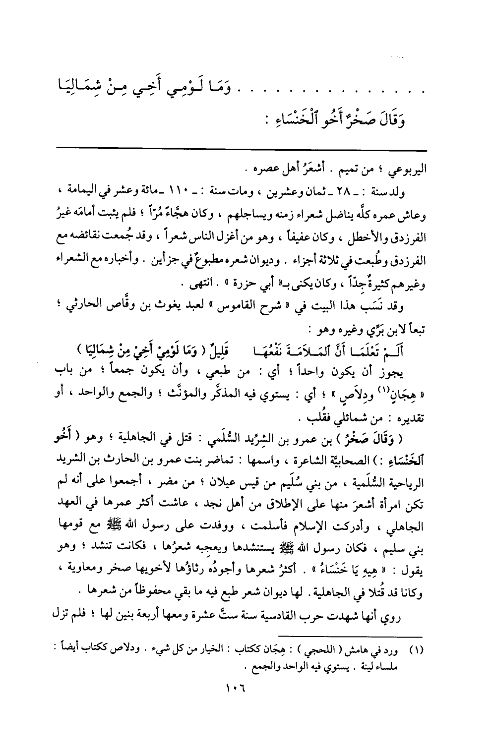 (وقال صخر) بن عمرو بن الشرّيد السّلمي: قتل في الجاهلية؛ وهو (أخو الخنساء:) الصحابيّة الشاعرة، واسمها: تماضر بنت عمرو بن الحارث بن الشريد الرياحية السّلمية، من بني سليم من قيس عيلان؛ من مضر، أجمعوا على أنه لم تكن امرأة أشعر منها على الإطلاق من أهل نجد، عاشت أكثر عمرها في العهد الجاهلي، وأدركت الإسلام فأسلمت، ووفدت على رسول الله صلّى الله عليه وسلم مع قومها بني سليم، فكان رسول الله صلّى الله عليه وسلم يستنشدها ويعجبه شعرها، فكانت تنشد؛ وهو يقول: «هيه يا خنساء» . أكثر شعرها وأجوده رثاؤها لأخويها صخر ومعاوية، وكانا قد قتلا في الجاهلية. لها ديوان شعر طبع فيه ما بقي محفوظا من شعرها.