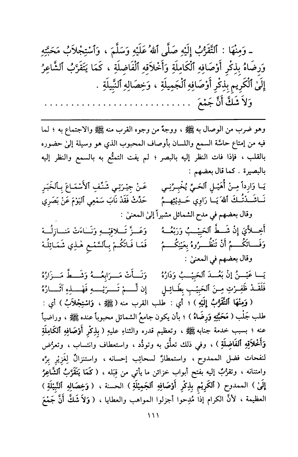 - ومنها: التّقرّب إليه صلّى الله عليه وسلّم، واستجلاب محبّته ورضاه بذكر أوصافه الكاملة وأخلاقه الفاضلة، كما يتقرّب الشّاعر إلى الكريم بذكر أوصافه الجميلة، وخصاله النّبيلة.