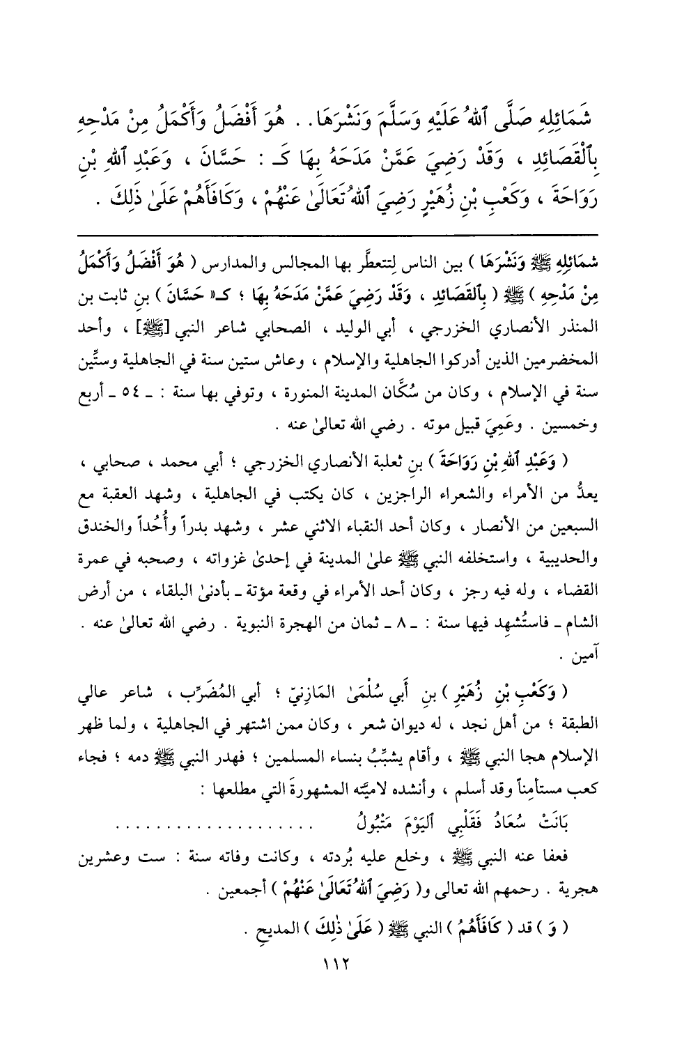 شمائله صلّى الله عليه وسلم ونشرها) بين الناس لتتعطّر بها المجالس والمدارس (هو أفضل وأكمل من مدحه) صلّى الله عليه وسلم (بالقصائد، وقد رضي عمّن مدحه بها؛ ك «حسّان) بن ثابت بن المنذر الأنصاري الخزرجي، أبي الوليد، الصحابي شاعر النبي [صلّى الله عليه وسلم] ، وأحد المخضرمين الذين أدركوا الجاهلية والإسلام، وعاش ستين سنة في الجاهلية وستّين سنة في الإسلام، وكان من سكّان المدينة المنورة، وتوفي بها سنة: - 54- أربع وخمسين. وعمي قبيل موته. رضي الله تعالى عنه.