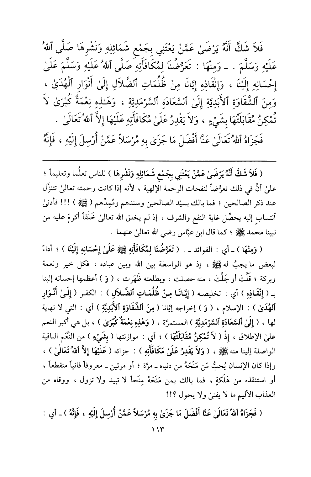 فلا شكّ أنّه يرضى عمّن يعتني بجمع شمائله ونشرها صلّى الله عليه وسلّم. - ومنها: تعرّضنا لمكافأته صلّى الله عليه وسلّم على إحسانه إلينا، وإنقاذه إيّانا من ظلمات الضّلال إلى أنوار الهدى، ومن الشّقاوة الأبديّة إلى السّعادة السّرمديّة، وهذه نعمة كبرى لا تمكن مقابلتها بشيء، ولا يقدر على مكافأته عليها إلّا الله تعالى.