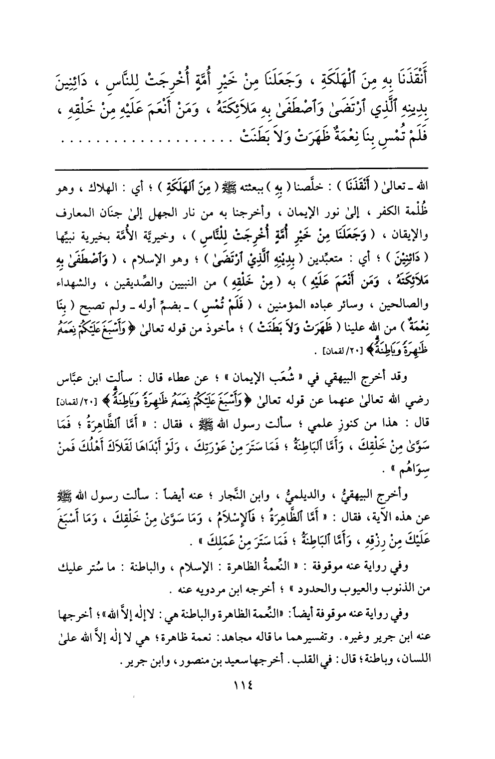 وفي رواية عنه موقوفة أيضا: «النّعمة الظاهرة والباطنة هي: لا إله إلّا الله» ؛ أخرجها عنه ابن جرير وغيره. وتفسيرهما ما قاله مجاهد: نعمة ظاهرة؛ هي لا إله إلّا الله على اللسان، وباطنة؛ قال: في القلب. أخرجها سعيد بن منصور، وابن جرير.