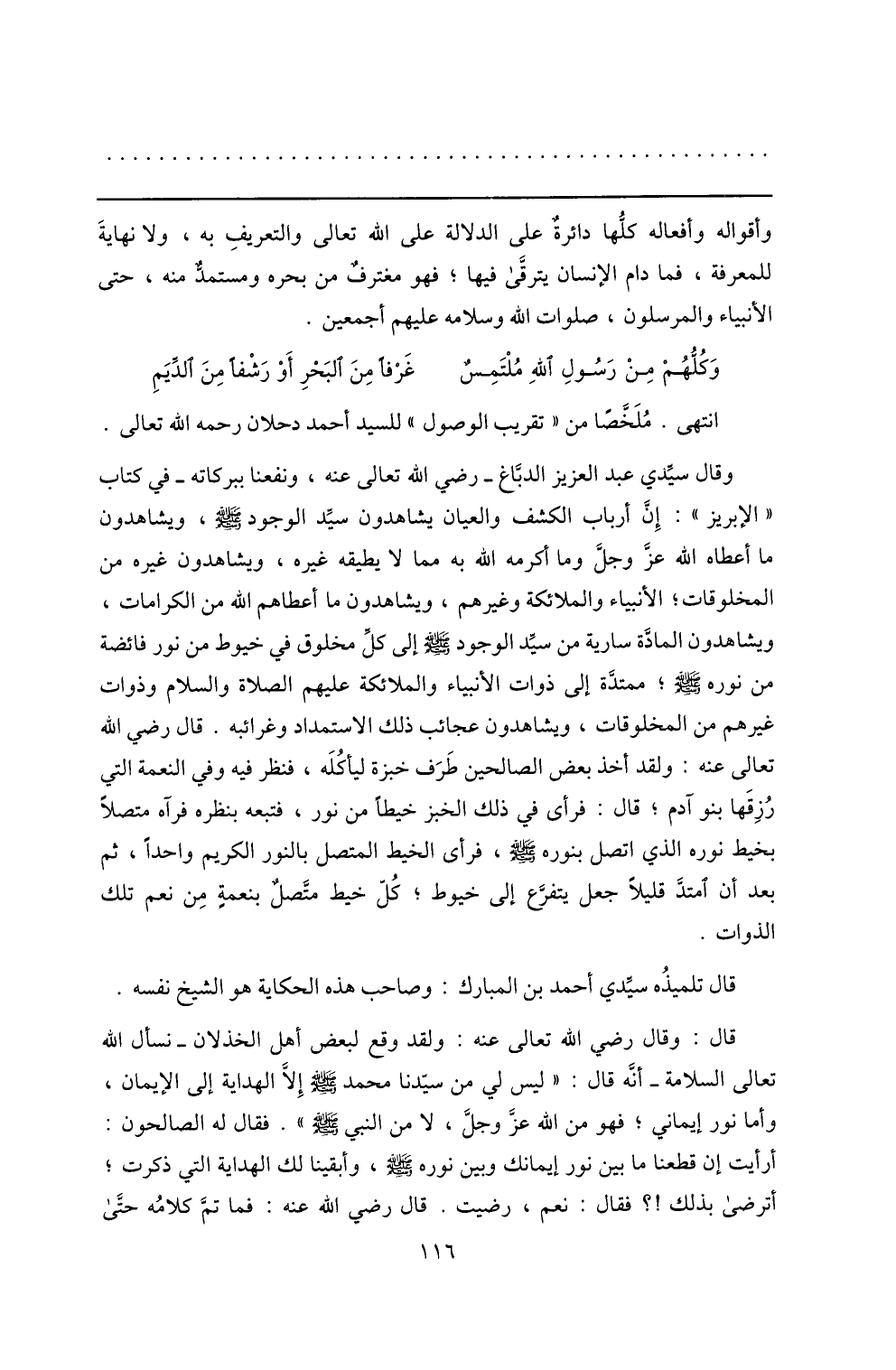 وقال سيّدي عبد العزيز الدبّاغ- رضي الله تعالى عنه، ونفعنا ببركاته- في كتاب «الإبريز» : إنّ أرباب الكشف والعيان يشاهدون سيّد الوجود صلّى الله عليه وسلم، ويشاهدون ما أعطاه الله عزّ وجلّ وما أكرمه الله به مما لا يطيقه غيره، ويشاهدون غيره من المخلوقات؛ الأنبياء والملائكة وغيرهم، ويشاهدون ما أعطاهم الله من الكرامات، ويشاهدون المادّة سارية من سيّد الوجود صلّى الله عليه وسلم إلى كلّ مخلوق في خيوط من نور فائضة من نوره صلّى الله عليه وسلم؛ ممتدّة إلى ذوات الأنبياء والملائكة عليهم الصلاة والسلام وذوات غيرهم من المخلوقات، ويشاهدون عجائب ذلك الاستمداد وغرائبه. قال رضي الله تعالى عنه: ولقد أخذ بعض الصالحين طرف خبزة ليأكله، فنظر فيه وفي النعمة التي رزقها بنو آدم؛ قال: فرأى في ذلك الخبز خيطا من نور، فتبعه بنظره فرآه متصلا بخيط نوره الذي اتصل بنوره صلّى الله عليه وسلم، فرأى الخيط المتصل بالنور الكريم واحدا، ثم بعد أن امتدّ قليلا جعل يتفرّع إلى خيوط؛ كلّ خيط متّصل بنعمة من نعم تلك الذوات.