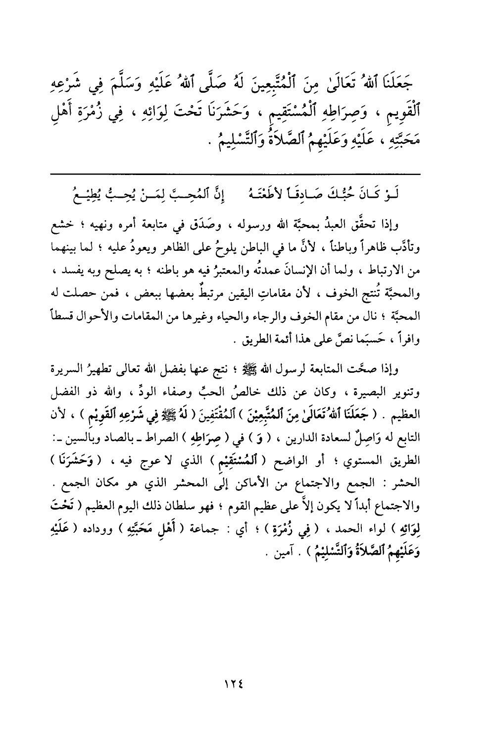 وإذا صحّت المتابعة لرسول الله صلّى الله عليه وسلم؛ نتج عنها بفضل الله تعالى تطهير السريرة وتنوير البصيرة، وكان عن ذلك خالص الحبّ وصفاء الودّ، والله ذو الفضل العظيم. (جعلنا الله تعالى من المتّبعين) المقتفين (له صلّى الله عليه وسلم في شرعه القويم) ، لأن التابع له واصل لسعادة الدارين، (و) في (صراطه) الصراط- بالصاد وبالسين-: