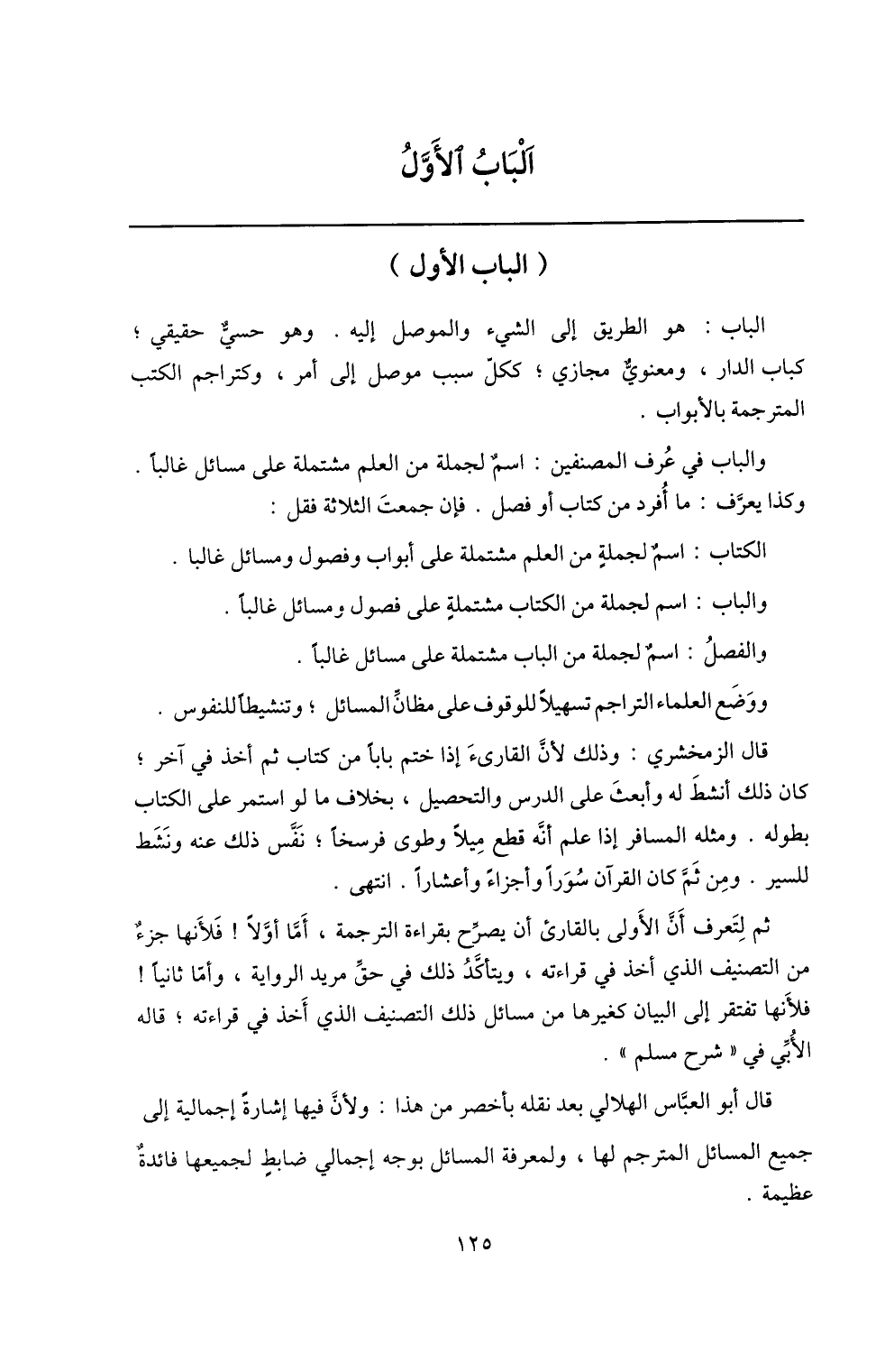 الباب الأوّل (الباب الأول) الباب: هو الطريق إلى الشيء والموصل إليه. وهو حسيّ حقيقي؛ كباب الدار، ومعنويّ مجازي؛ ككلّ سبب موصل إلى أمر، وكتراجم الكتب المترجمة بالأبواب.