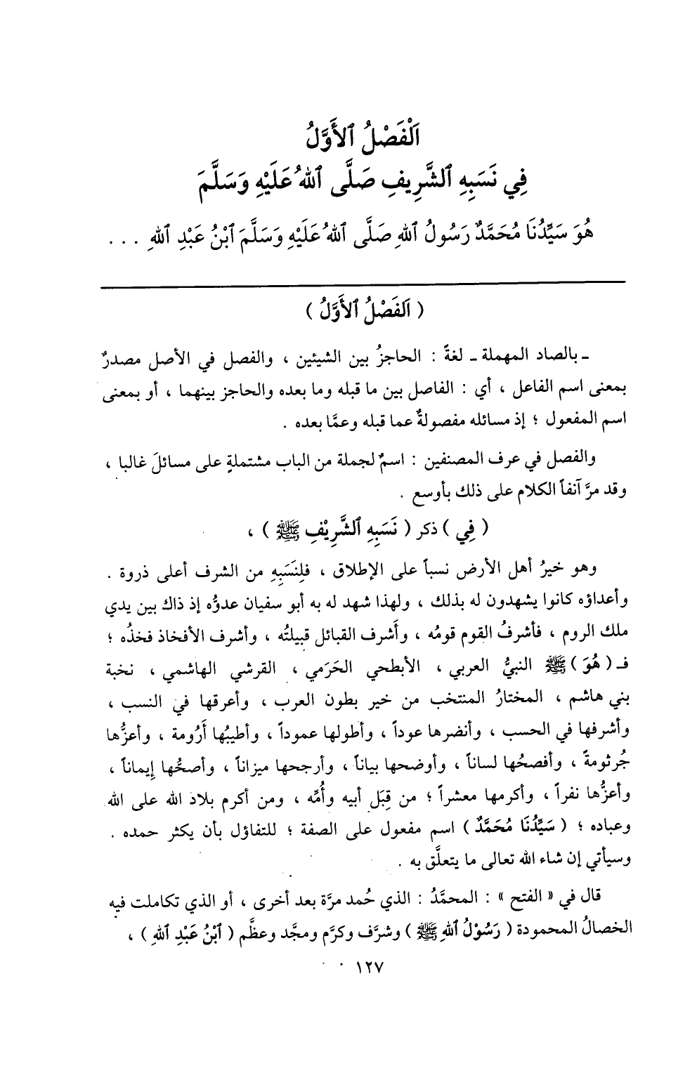 الفصل الأوّل في نسبه الشّريف صلّى الله عليه وسلّم هو سيّدنا محمّد رسول الله صلّى الله عليه وسلّم ابن عبد الله ...