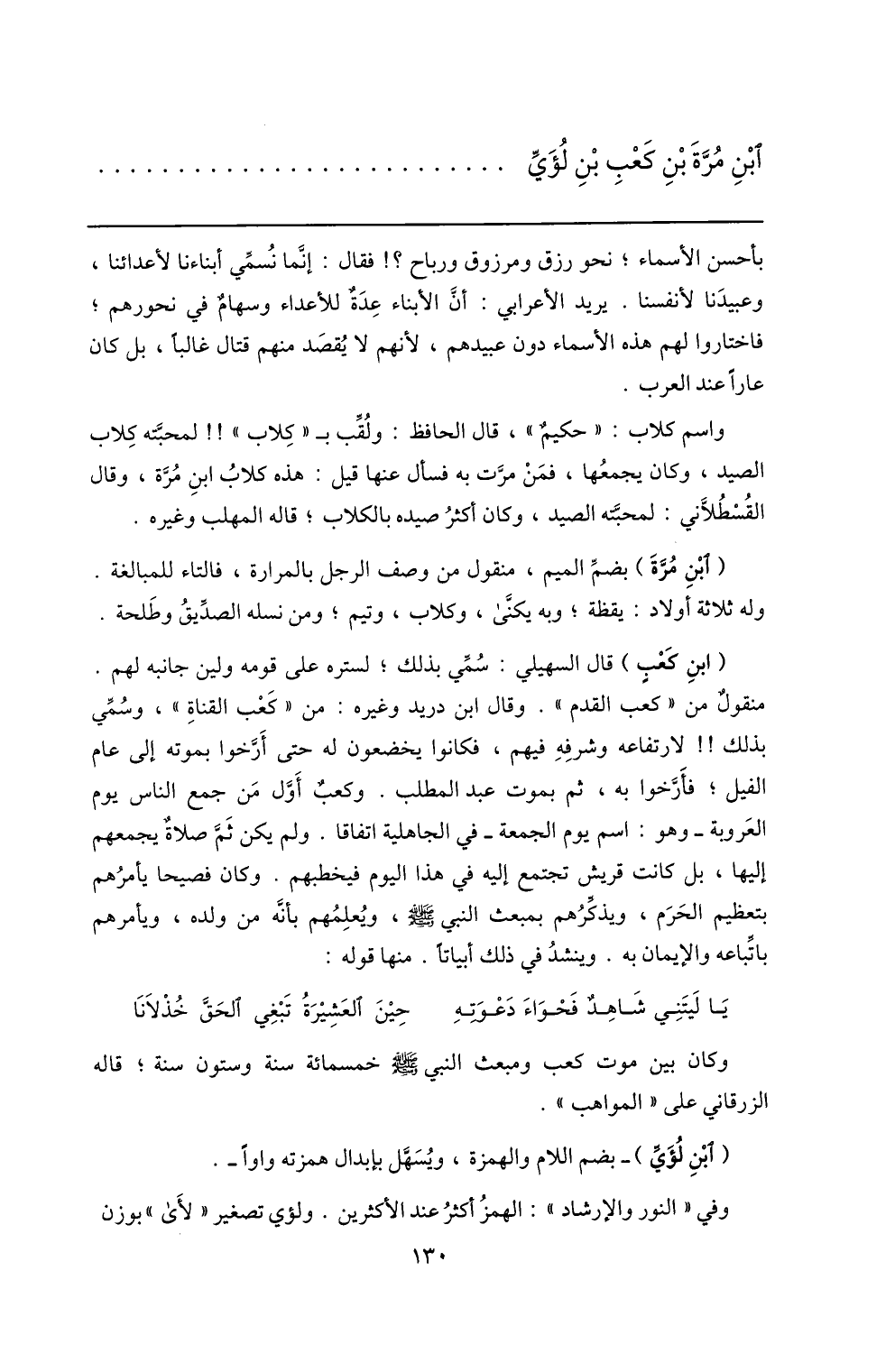 منقول من «كعب القدم» . وقال ابن دريد وغيره: من «كعب القناة» ، وسمّي بذلك!! لارتفاعه وشرفه فيهم، فكانوا يخضعون له حتى أرّخوا بموته إلى عام الفيل؛ فأرّخوا به، ثم بموت عبد المطلب. وكعب أوّل من جمع الناس يوم العروبة- وهو: اسم يوم الجمعة- في الجاهلية اتفاقا. ولم يكن ثمّ صلاة يجمعهم إليها، بل كانت قريش تجتمع إليه في هذا اليوم فيخطبهم. وكان فصيحا يأمرهم بتعظيم الحرم، ويذكّرهم بمبعث النبي صلّى الله عليه وسلم، ويعلمهم بأنّه من ولده، ويأمرهم باتّباعه والإيمان به. وينشد في ذلك أبياتا. منها قوله: