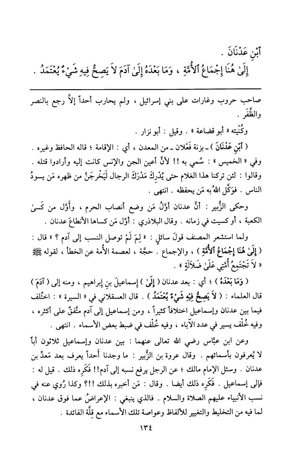 فإلى إسماعيل. فكره ذلك أيضا. وقال: من أخبره بذلك!!؟ وكذا روي عنه في نسب الأنبياء عليهم الصلاة والسلام. فالذي ينبغي: الإعراض عما فوق عدنان، لما فيه من التخليط والتغيير للألفاظ وعواصة تلك الأسماء مع قلّة الفائدة.