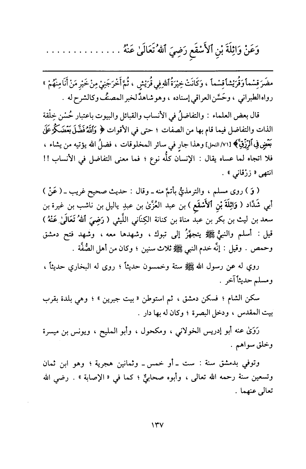 (و) روى مسلم، والترمذيّ بأتمّ منه- وقال: حديث صحيح غريب- (عن) أبي شدّاد (واثلة بن الأسقع) بن عبد العزّى بن عبد ياليل بن ناشب بن غيرة بن سعد بن ليث بن بكر بن عبد مناة بن كنانة الكناني اللّيثي (رضي الله تعالى عنه) قيل: أسلم والنبيّ صلّى الله عليه وسلم يتجهّز إلى تبوك، وشهدها معه، وشهد فتح دمشق وحمص. وقيل: إنّه خدم النبي صلّى الله عليه وسلم ثلاث سنين؛ وكان من أهل الصّفّة.