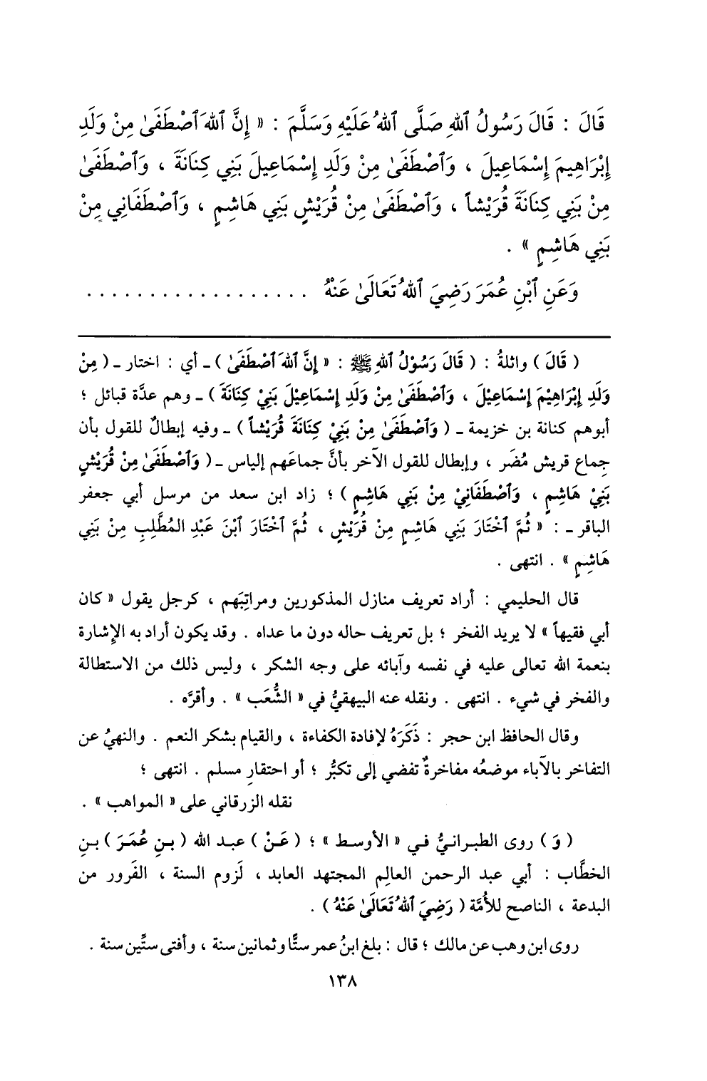 وقال الحافظ ابن حجر: ذكره لإفادة الكفاءة، والقيام بشكر النعم. والنهي عن التفاخر بالآباء موضعه مفاخرة تفضي إلى تكبّر؛ أو احتقار مسلم. انتهى؛ نقله الزرقاني على «المواهب» .