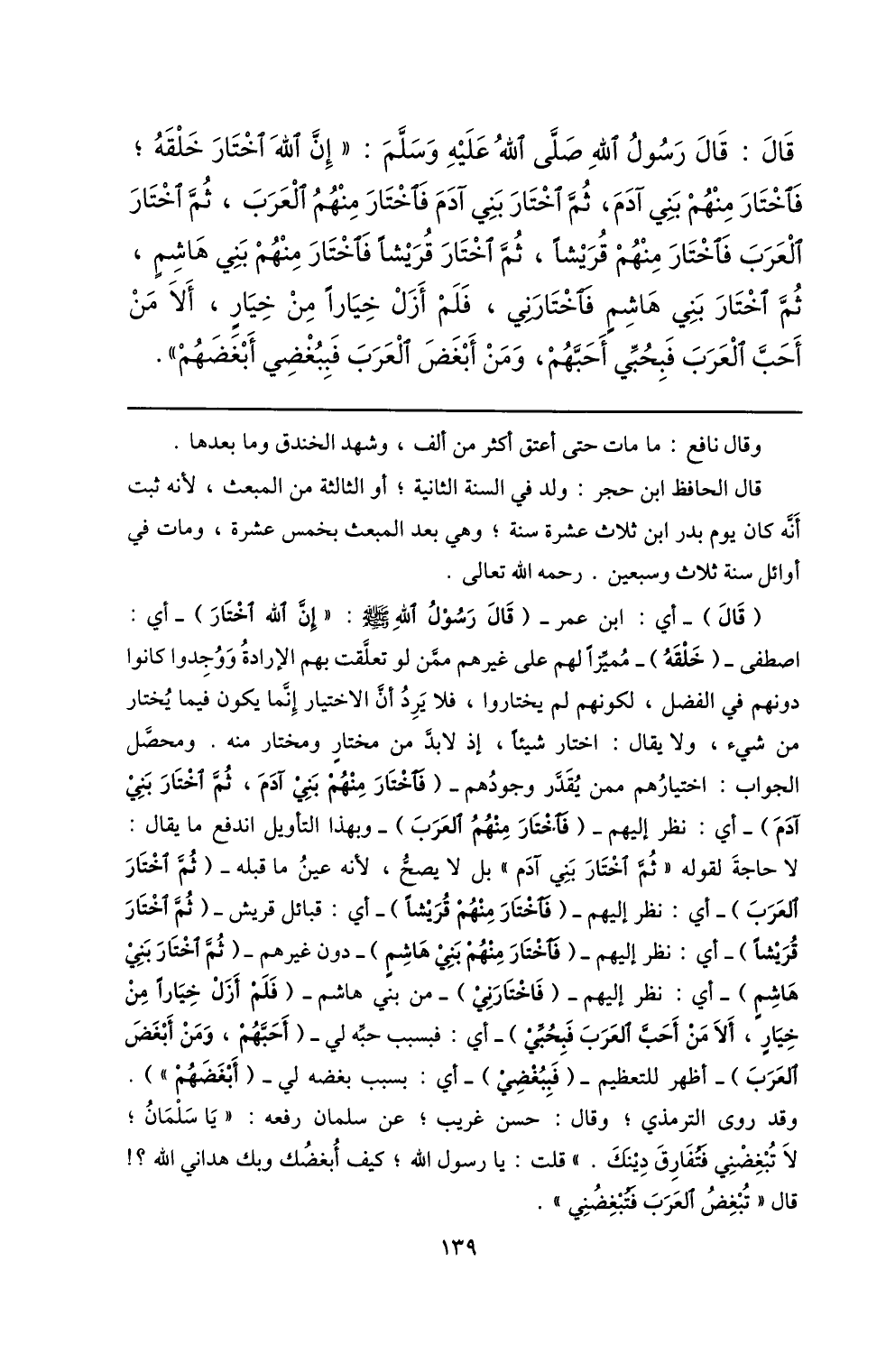 لا حاجة لقوله «ثمّ اختار بني آدم» بل لا يصحّ، لأنه عين ما قبله- (ثمّ اختار العرب) - أي: نظر إليهم- (فاختار منهم قريشا) - أي: قبائل قريش- (ثمّ اختار قريشا) - أي: نظر إليهم- (فاختار منهم بني هاشم) - دون غيرهم- (ثمّ اختار بني هاشم) - أي: نظر إليهم- (فاختارني) - من بني هاشم- (فلم أزل خيارا من خيار، ألا من أحبّ العرب فبحبّي) - أي: فبسبب حبّه لي- (أحبّهم، ومن أبغض العرب) - أظهر للتعظيم- (فببغضي) - أي: بسبب بغضه لي- (أبغضهم» ) .