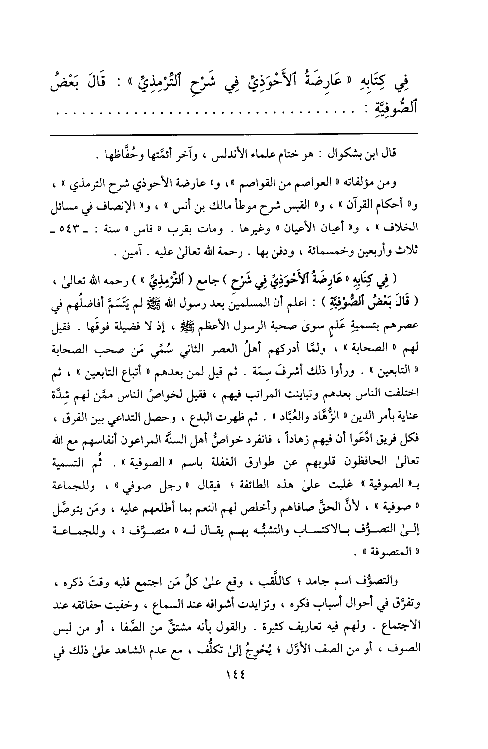 (في كتابه «عارضة الأحوذيّ في شرح) جامع (التّرمذيّ» ) رحمه الله تعالى، (قال بعض الصّوفيّة) : اعلم أن المسلمين بعد رسول الله صلّى الله عليه وسلم لم يتسمّ أفاضلهم في عصرهم بتسمية علم سوى صحبة الرسول الأعظم صلّى الله عليه وسلم، إذ لا فضيلة فوقها. فقيل لهم «الصحابة» ، ولمّا أدركهم أهل العصر الثاني سمّي من صحب الصحابة «التابعين» . ورأوا ذلك أشرف سمة. ثم قيل لمن بعدهم «أتباع التابعين» ، ثم اختلفت الناس بعدهم وتباينت المراتب فيهم، فقيل لخواصّ الناس ممّن لهم شدّة عناية بأمر الدين «الزّهّاد والعبّاد» . ثم ظهرت البدع، وحصل التداعي بين الفرق، فكل فريق ادّعوا أن فيهم زهادا، فانفرد خواصّ أهل السنّة المراعون أنفاسهم مع الله تعالى الحافظون قلوبهم عن طوارق الغفلة باسم «الصوفية» . ثم التسمية ب «الصوفية» ، غلبت على هذه الطائفة؛ فيقال «رجل صوفي» ، وللجماعة «صوفية» ، لأنّ الحقّ صافاهم وأخلص لهم النعم بما أطلعهم عليه، ومن يتوصّل إلى التصوّف بالاكتساب والتشبّه بهم يقال له «متصوّف» ، وللجماعة «المتصوفة» .