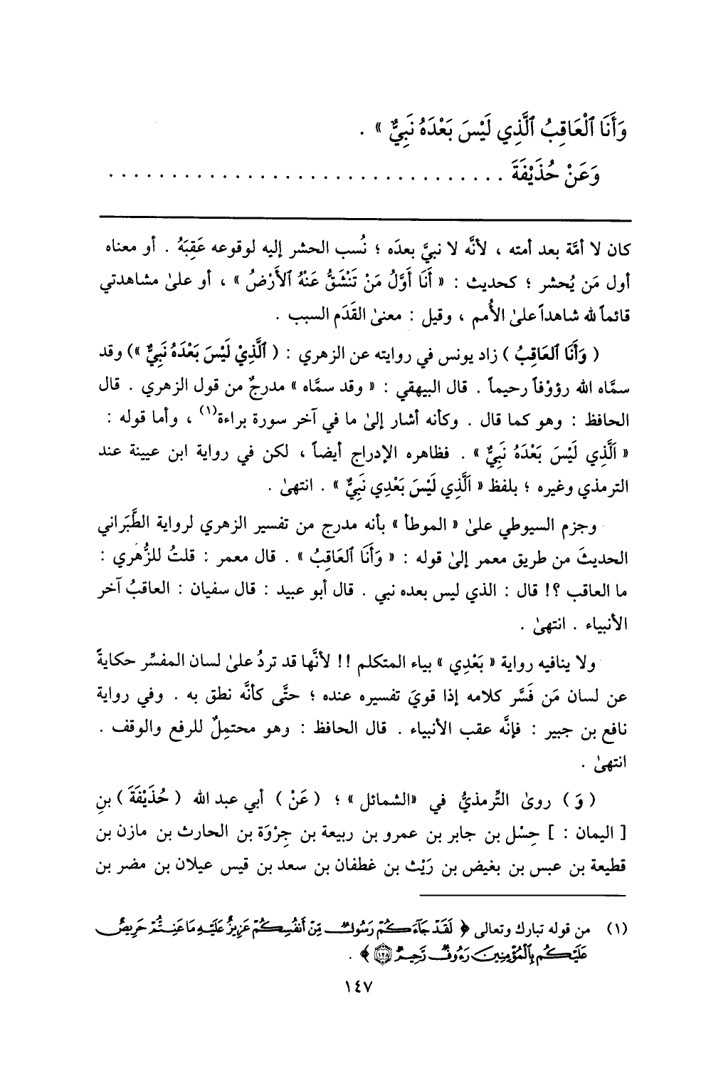 ولا ينافيه رواية «بعدي» بياء المتكلم!! لأنّها قد ترد على لسان المفسّر حكاية عن لسان من فسّر كلامه إذا قوي تفسيره عنده؛ حتّى كأنّه نطق به. وفي رواية نافع بن جبير: فإنّه عقب الأنبياء. قال الحافظ: وهو محتمل للرفع والوقف.