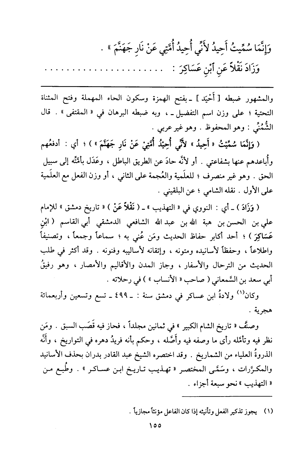 (وإنّما سمّيت «أحيد» لأنّي أحيد أمّتي عن نار جهنّم» ) ؛ أي: أدفعهم وأباعدهم عنها بشفاعتي. أو لأنّه حاد عن الطريق الباطل، وعدل بأمّتّه إلى سبيل الحق. وهو غير منصرف؛ للعلمية والعجمة على الثاني، أو وزن الفعل مع العلمية على الأول. نقله الشامي؛ عن البلقيني.