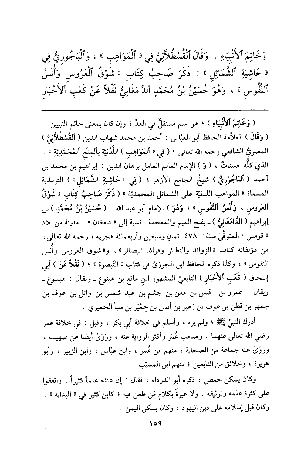 الذي كلّه حسنات، (و) الإمام العالم العامل برهان الدين: إبراهيم بن محمد بن أحمد (الباجوريّ) شيخ الجامع الأزهر؛ (في «حاشية الشّمائل» ) الترمذية المسماة «المواهب اللدنيّة على الشمائل المحمديّة» (ذكر صاحب كتاب «شوق العروس، وأنس النّفوس» ؛ وهو) الإمام أبو عبد الله: (حسين بن محمّد) بن إبراهيم (الدّامغانيّ) - بفتح الميم والمعجمة- نسبة إلى «دامغان» : مدينة من بلاد «قومس» المتوفّى سنة: - 478- ثمان وسبعين وأربعمائة هجرية، رحمه الله تعالى، من مؤلفاته كتاب «الزوائد والنظائر وفوائد البصائر» ، و «شوق العروس وأنس النفوس» ، وكذا ذكره الحافظ ابن الجوزيّ في كتاب «التّبصرة» ؛ (نقلا عن) أبي إسحاق (كعب الأحبار) التابعيّ المشهور ابن ماتع بن هينوع- ويقال: هيسوع- ويقال: عمرو بن قيس بن معن بن جشم بن عبد شمس بن وائل بن عوف بن جمهر بن قطن بن عوف بن زهير بن أيمن بن حمير بن سبأ الحميري.