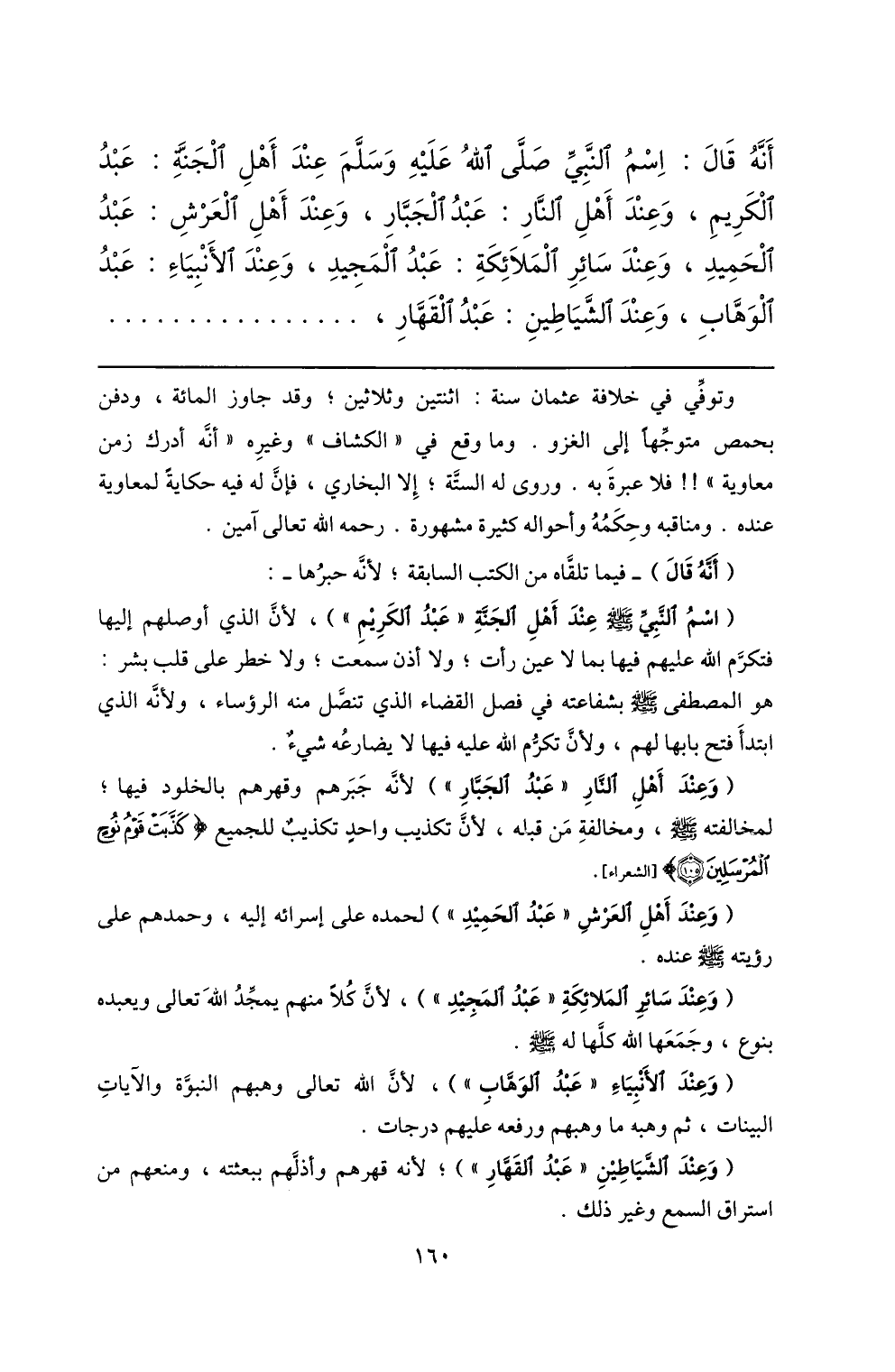 أنّه قال: اسم النّبيّ صلّى الله عليه وسلّم عند أهل الجنّة: عبد الكريم، وعند أهل النّار: عبد الجبّار، وعند أهل العرش: عبد الحميد، وعند سائر الملائكة: عبد المجيد، وعند الأنبياء: عبد الوهّاب، وعند الشّياطين: عبد القهّار، ...
