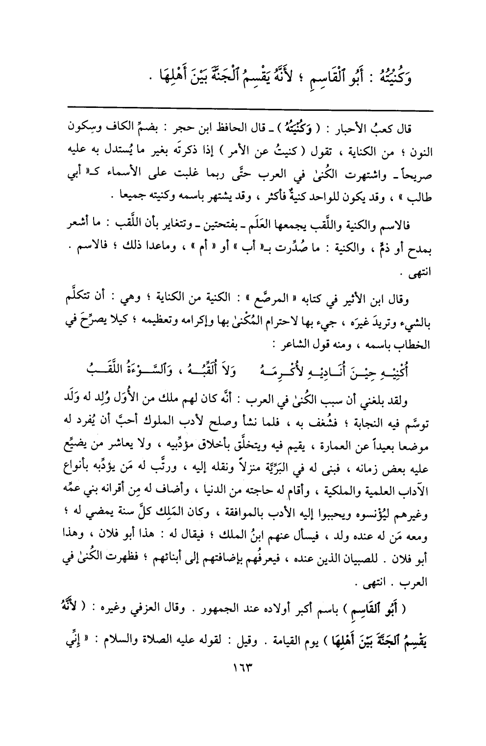 قال كعب الأحبار: (وكنيته) - قال الحافظ ابن حجر: بضمّ الكاف وسكون النون؛ من الكناية، تقول (كنيت عن الأمر) إذا ذكرته بغير ما يستدل به عليه صريحا- واشتهرت الكنى في العرب حتّى ربما غلبت على الأسماء ك «أبي طالب» ، وقد يكون للواحد كنية فأكثر، وقد يشتهر باسمه وكنيته جميعا.