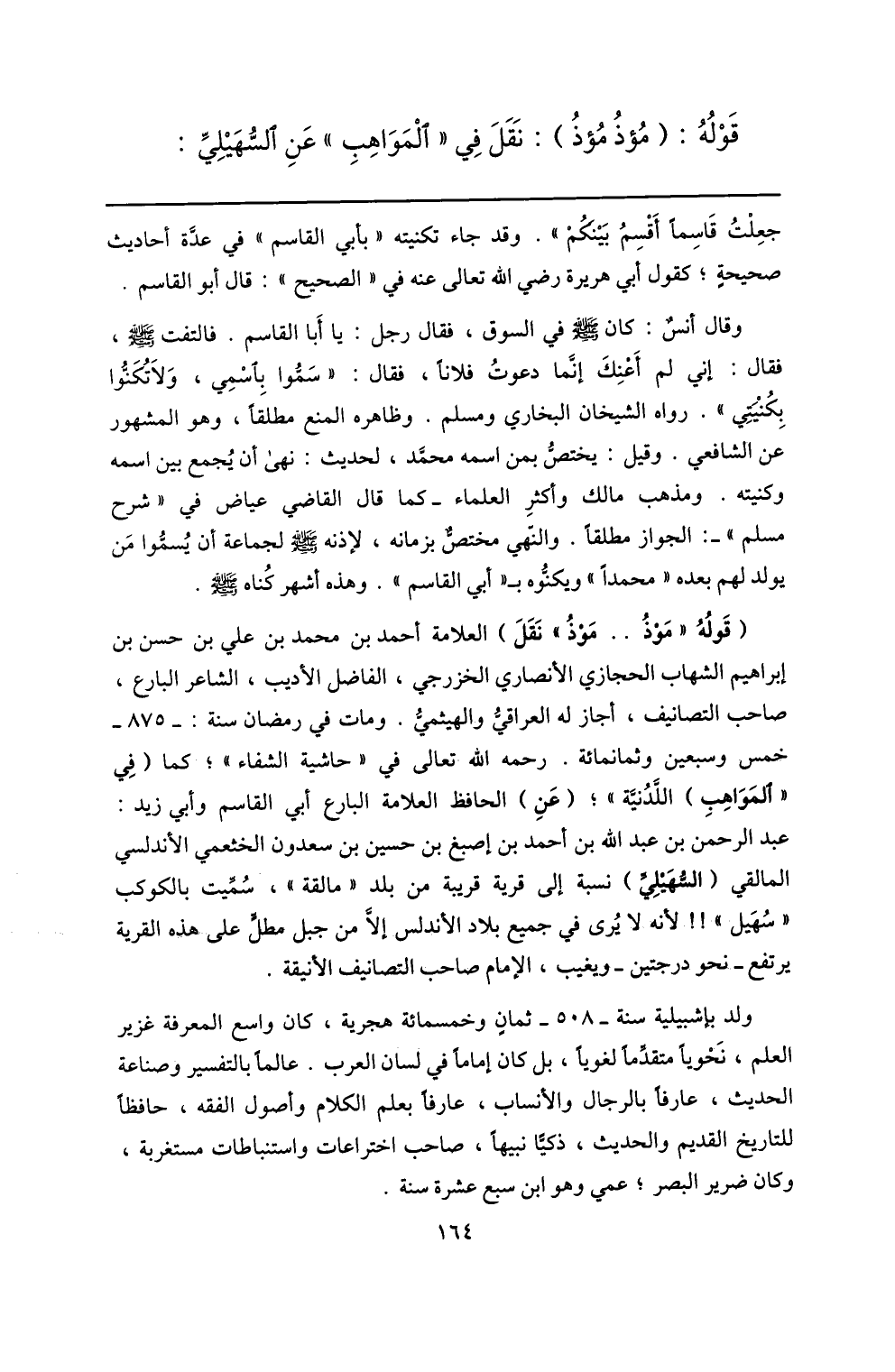 وقال أنس: كان صلّى الله عليه وسلم في السوق، فقال رجل: يا أبا القاسم. فالتفت صلّى الله عليه وسلم، فقال: إني لم أعنك إنّما دعوت فلانا، فقال: «سمّوا باسمي، ولا تكنّوا بكنيتي» . رواه الشيخان البخاري ومسلم. وظاهره المنع مطلقا، وهو المشهور عن الشافعي. وقيل: يختصّ بمن اسمه محمّد، لحديث: نهى أن يجمع بين اسمه وكنيته. ومذهب مالك وأكثر العلماء- كما قال القاضي عياض في «شرح مسلم» -: الجواز مطلقا. والنّهي مختصّ بزمانه، لإذنه صلّى الله عليه وسلم لجماعة أن يسمّوا من يولد لهم بعده «محمدا» ويكنّوه ب «أبي القاسم» . وهذه أشهر كناه صلّى الله عليه وسلم.